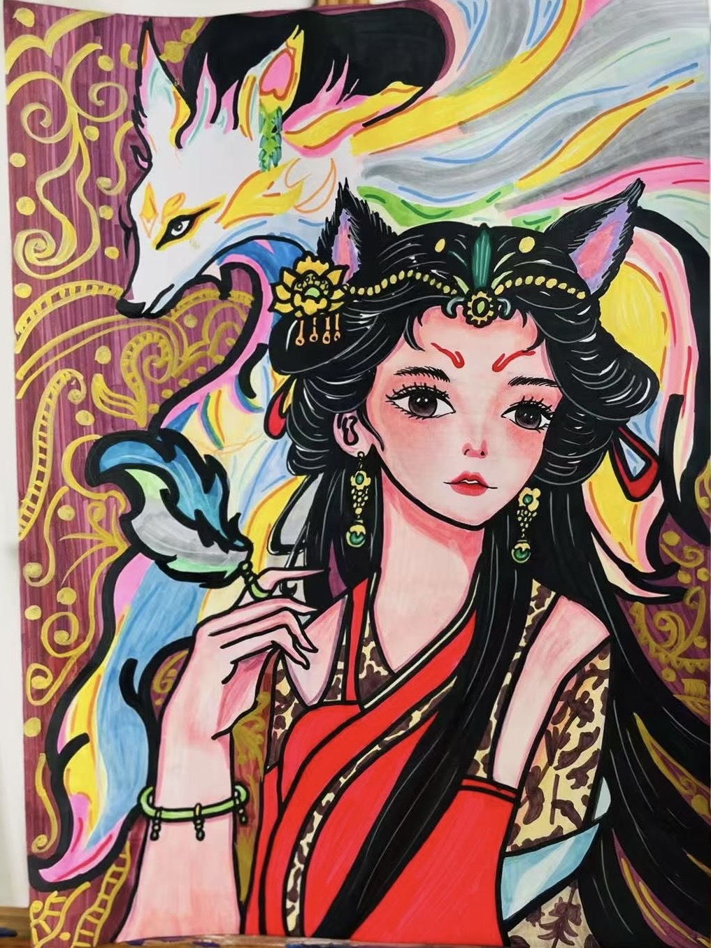 我的作品是以陕西骊山狐妖传说为骨,融陇县妲己故里的民间轶闻,绘就一位承继三秦古韵的狐面女子——她鬓边金饰缠盛唐纹样,衣袂红焰染周秦烽火余温,身侧灵狐衔着终南云气而来。这是长安残烬里醒转的精魂:既藏着陇县瓦砟滩的秦砖旧梦,也带着骊山古谷的风,将陕西千年的妖异与沧桑,凝在眉眼的朱砂痣里。