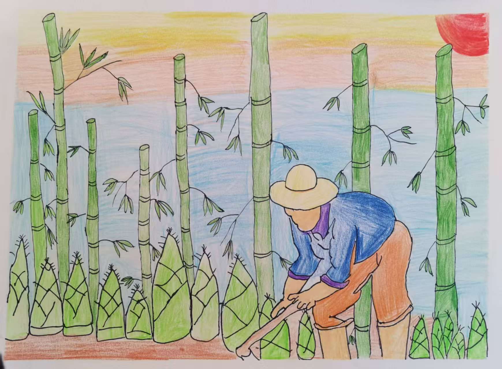 这幅画展现了一片竹林劳作的场景:画面左侧是大片翠绿的竹子与竹笋,竹身挺拔、竹叶清新;中间一位戴着草帽、穿蓝上衣橙短裤的劳动者,手持工具似在劳作;背景天空由蓝渐变橙黄,右下角还有红色的太阳,营造出温暖的氛围。整体色彩明快,通过鲜艳的色调展现出乡村劳作的活力与自然的美好,仿佛传递出辛勤耕耘、收获希望的意境。