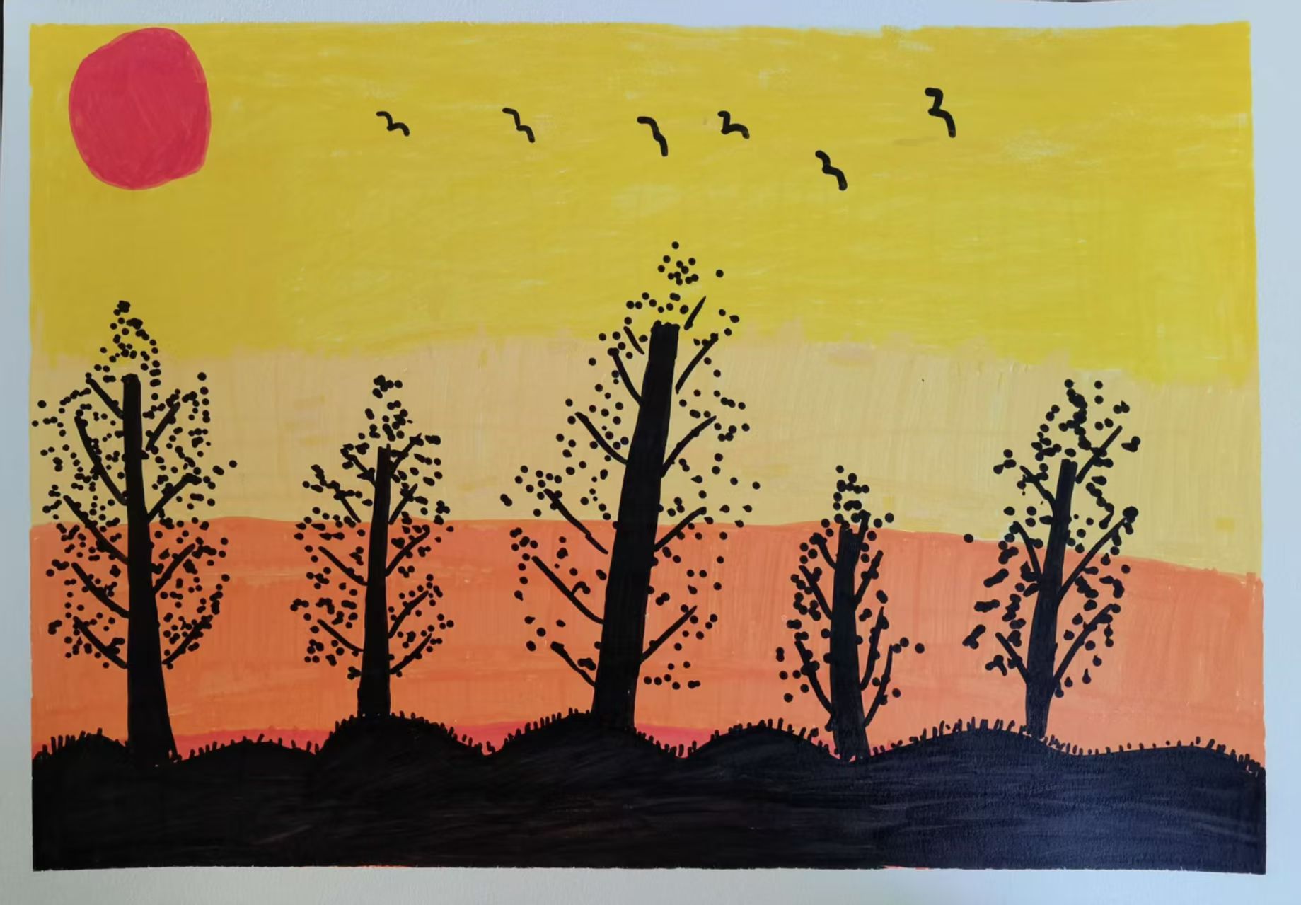 这幅画是一幅充满自然气息的手绘作品。画面土地上面生长着五棵树木,树枝以简洁的线条勾勒,枝头用黑点表现树叶。背景是橙黄渐变的天空,右侧有一轮红色的太阳,增添了温暖的氛围。天空中还有几只简笔勾勒的飞鸟,整体风格简洁明快,通过色彩和线条的搭配,营造出一种宁静而美好的自然景象,仿佛是在描绘黄昏时分的郊外风光。