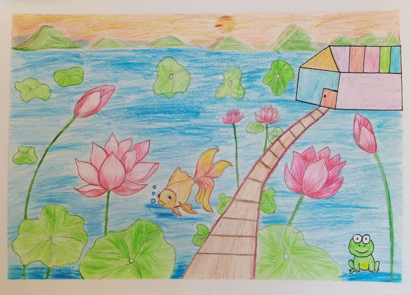 这幅画展现了充满生机的荷塘小景,蓝色水面上,大片绿色荷叶与粉色荷花(含绽放、花苞)相映成趣,还有小巧的浮萍点缀。一条橙色金鱼吐着泡泡游过,左下角绿色青蛙增添灵动。画面下方,一座色彩斑斓的小房子(蓝顶、粉紫墙、彩条装饰)通过木桥与荷塘相连。整体用彩铅绘制,色彩明快,营造出童趣满满的夏日池塘氛围。