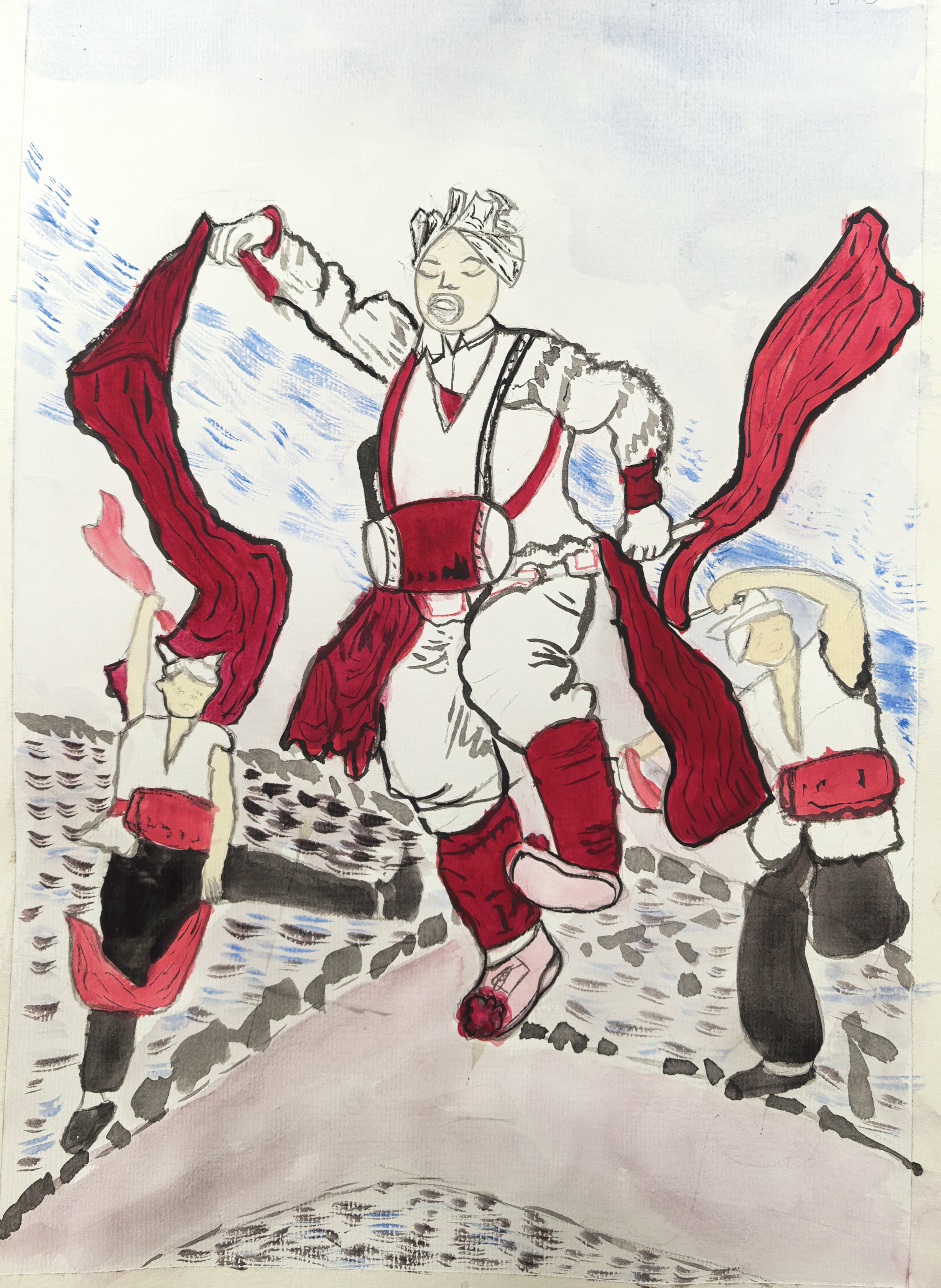 这幅作品以"鼓魂载土,红绸跃风"为核心,提炼安塞腰鼓"五劲"(能、虎、蛮、狠、猛)的精神内核,将黄土高原的粗犷与生命的炽热凝于笔端。 画面以中心鼓手为张力焦点:白羊肚手巾裹着黄土的风,白褂红带撞出陕北的魂,踢腿腾跃间复刻"金鸡独立"凤凰展翅"的传统招式,鼓槌起落如战鼓惊雷,红绸翻飞似烈焰燎原。两侧舞者以简化动作呼应,衬出群体表演的磅礴气势,背景的石滩与淡蓝云天,暗合腰鼓从战场到乡野的时空流转。 不追求技法复刻,而以写意笔触抓"劲"——鼓点震裂沟壑的悍,红绸缠住岁月的烈,让观者从墨色浓淡里触到黄土地的心跳,见鼓见人,更见生生不息的黄土精神。