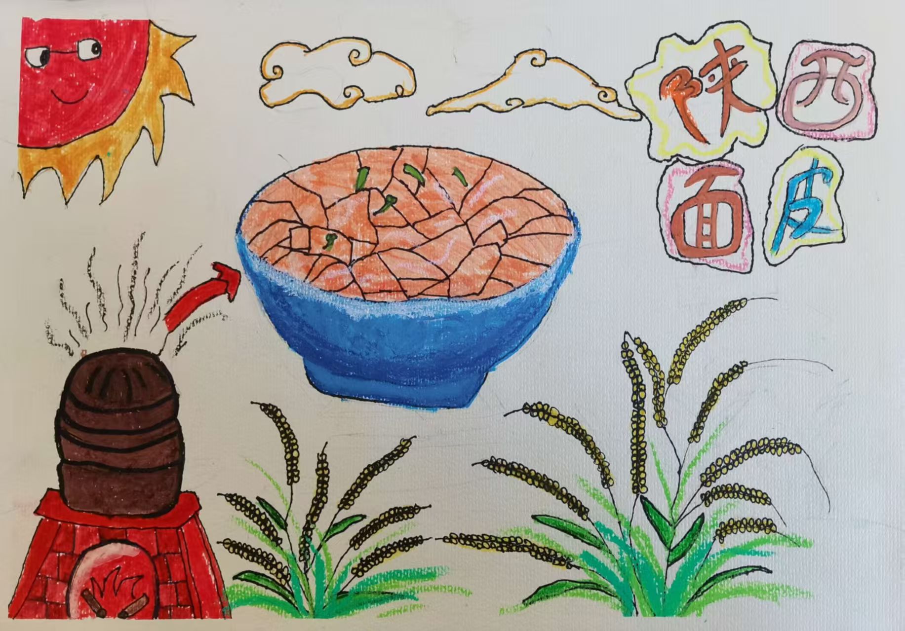 这幅画以陕西面皮为主题,画面布局:左侧是两簇带金黄谷穗的绿色植株,右上角有个带笑脸的红太阳,还有两朵云。中间上方有灶台和蒸笼,箭头指向一碗香辣面皮。右下角用艺术字写着"陕西面皮"。色彩风格:色彩鲜艳,用红、黄、绿、蓝等色,太阳、云朵、植株、餐具等形象生动,整体风格童趣活泼,通过灶台、谷物、面皮等元素,展现陕西面皮的制作关联与地域美食特色。
