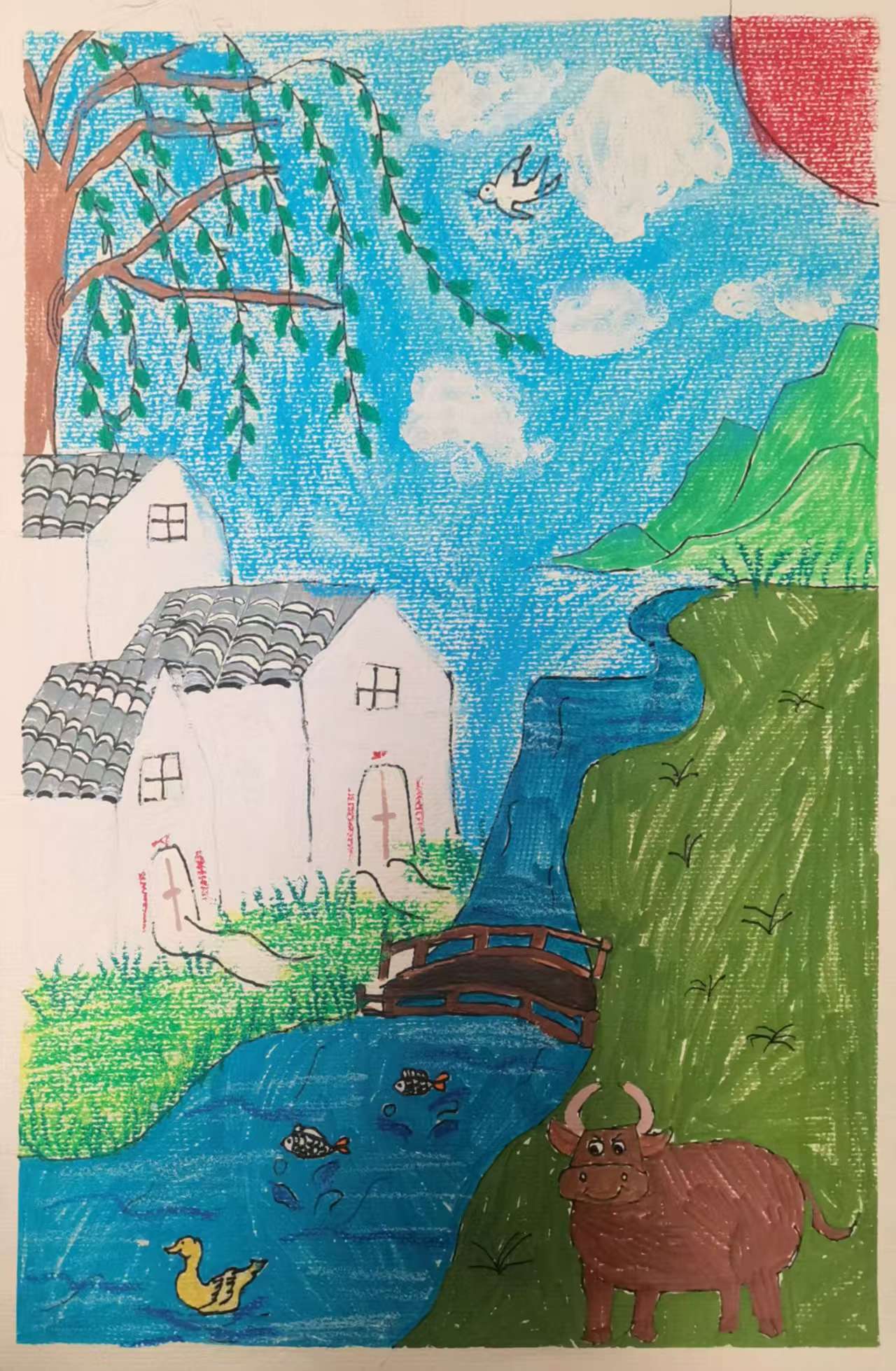 这幅画是一幅充满童趣的风景画,可分为上下两部分。上半部分展现了户外自然与建筑:背景是蓝天、绿山和带光芒的太阳,山间有彩虹;中间有两棵树,左侧是垂柳,右侧有房屋,其中一栋绿墙红顶,另一栋橙墙红顶,还有灰色道路和栅栏。下半部分是几座房屋,色彩明快,有黄、蓝等色,搭配绿色草地,整体色彩鲜艳,充满童真,描绘了一个美好温馨的家园场景。