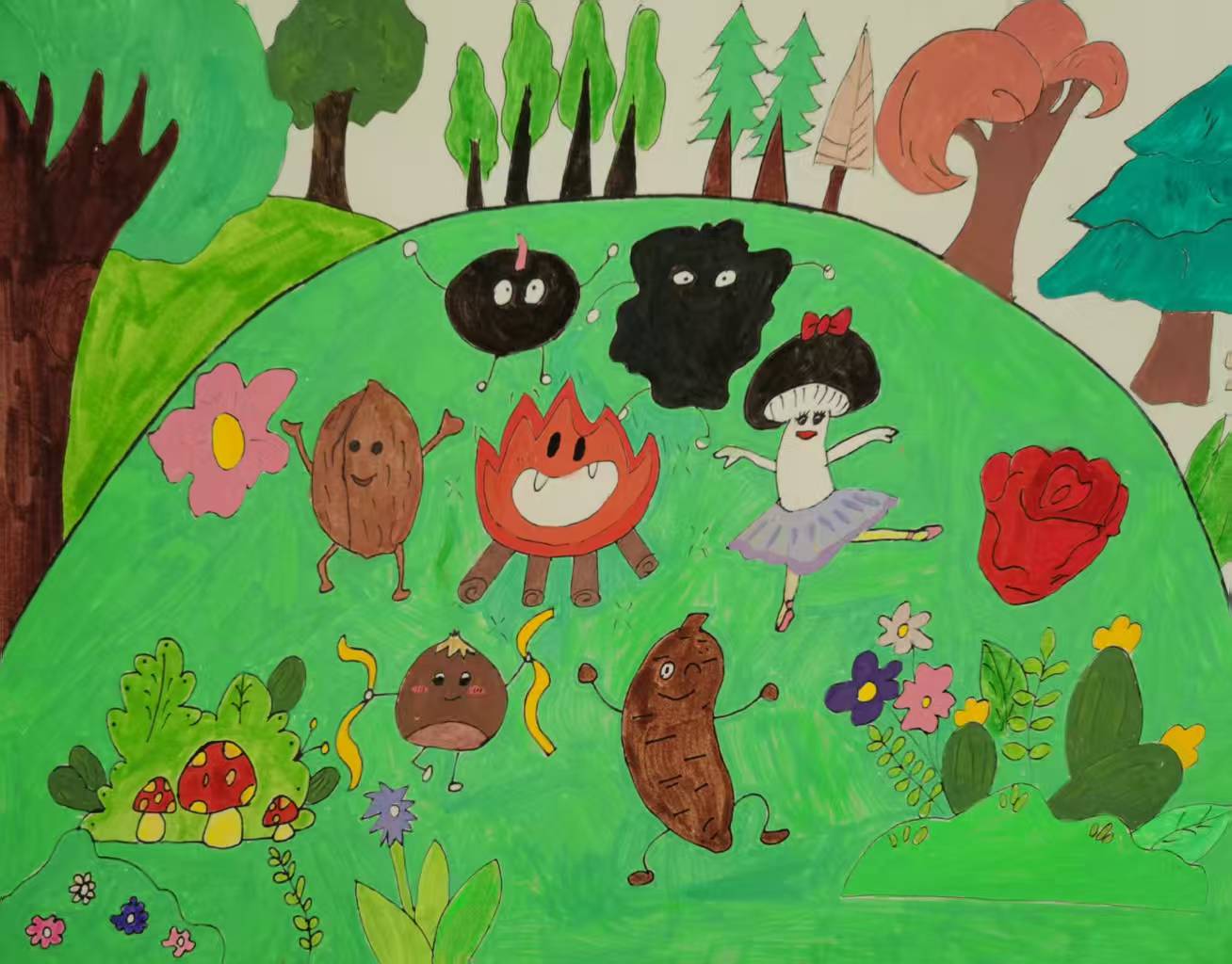 我的家乡宁陕,是安康北地最偏的小县城,窝在秦岭褶皱里,却是山珍们的快乐老家!一到丰收季,胖香菇、软木耳挤挤挨挨,天麻、魔芋藏在土缝里探头,板栗裹着刺刺小铠甲,核桃穿紫褐外衣滚来滚去。 秋风"呼"地一吹,山珍舞会开场啦!板栗举着小刺话筒喊:"欢迎来深山派对!又和大家见面咯!"核桃急得晃外壳:"快跳舞快跳舞!" 山珍们手拉手围起火堆,香菇晃圆肚子扭,木耳甩软耳朵摇,板栗"咔嚓"笑出脆响,核桃滚着打转转。茂密林子里,树叶拍着手,风哼着调,满是甜甜的丰收味儿!