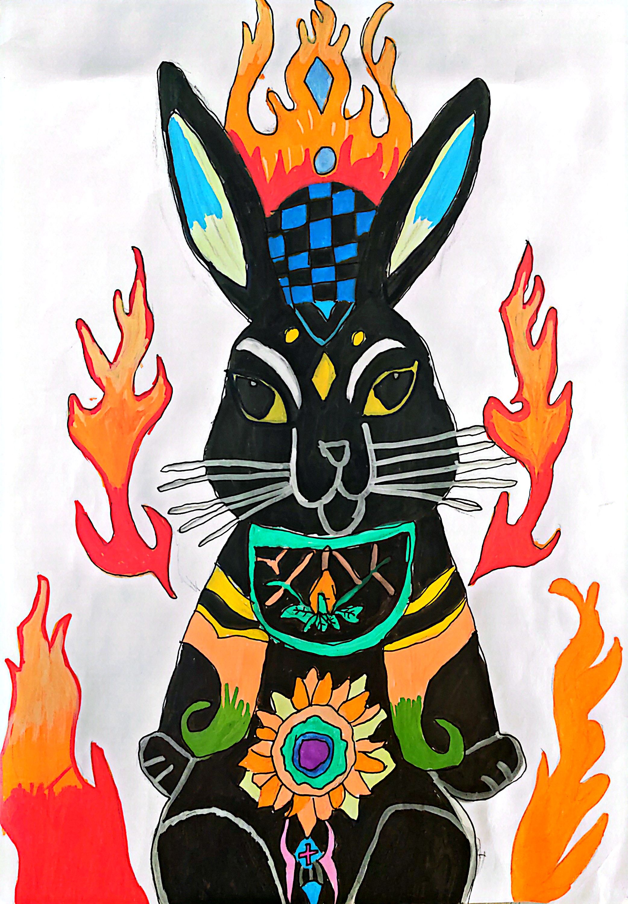 融合西北民俗中的"瑞兔"意象与敦煌壁画的装饰美学——兔身纹样取莫高窟的火焰纹、宝相花纹,炽焰元素呼应西北高原的"火祭"民俗,配饰的宝石纹样复刻丝路商道的珠宝形制。浓烈撞色贴合西北艺术的奔放特质,既让瑞兔承载祈福寓意,也借装饰细节藏住丝路文化的多元交融,鲜活呈现西北民俗的奇幻与厚重。