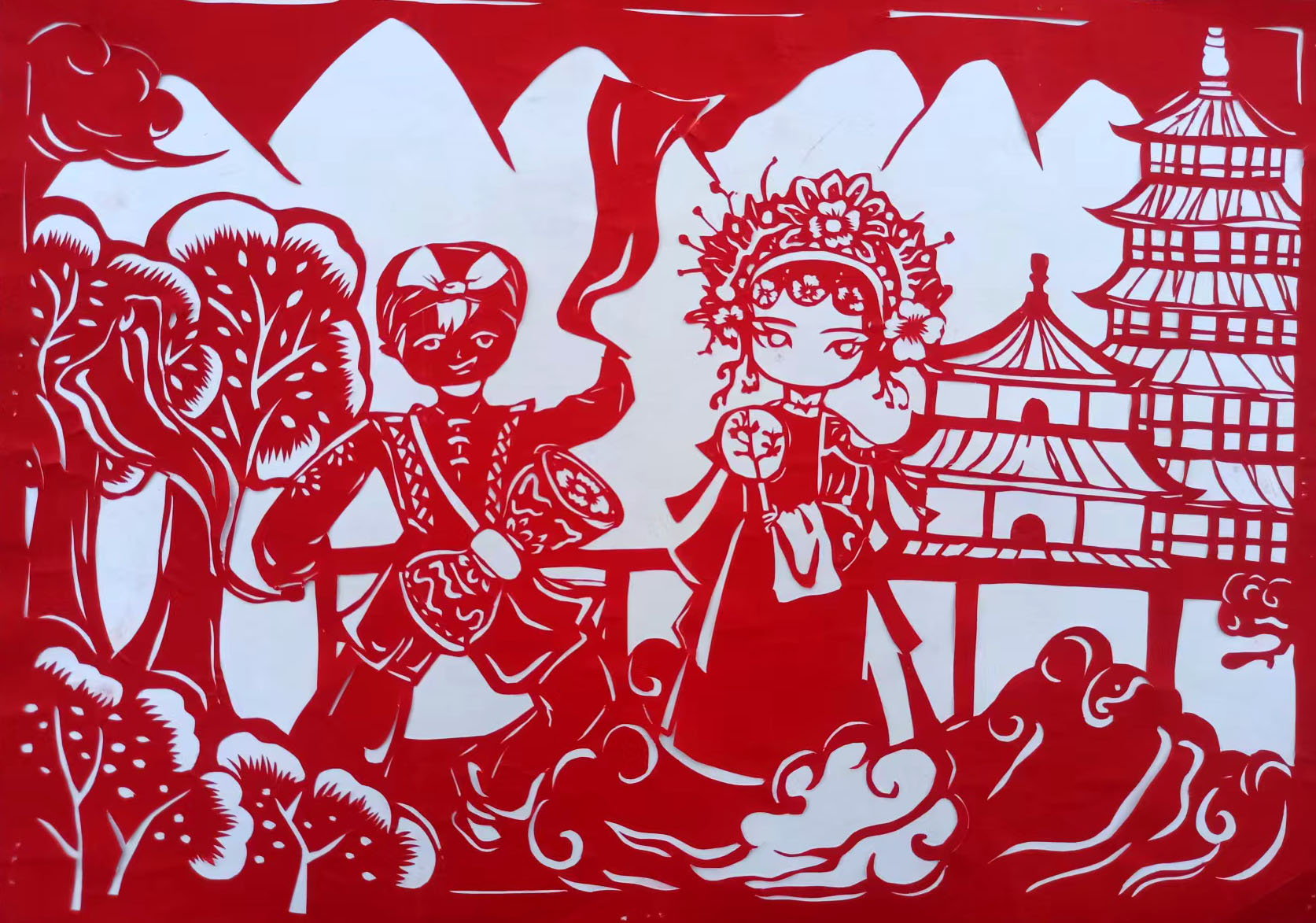 作品以红白纸的刀刻肌理,织就陕西文化与生态的共生图景。画面核心的秦腔花旦与打腰鼓男孩,是秦地魂魄的具象:花旦凤冠缠满秦腔婉转气韵,腰鼓男孩腾跃裹着安塞鼓点豪迈,二者相衬,让传统民俗在少年身上新生。背景大雁塔飞檐、秦岭轮廓锚定地域根脉,下方祥云晕染出三秦文化的灵动"神气";男孩旁的树与草丛,又将生态守护意涵织入传统肌理——既以剪纸承续秦地文脉厚重,又借绿意传递对三秦生态的珍视,让文化根脉与绿色生机在红纸上同频生长。