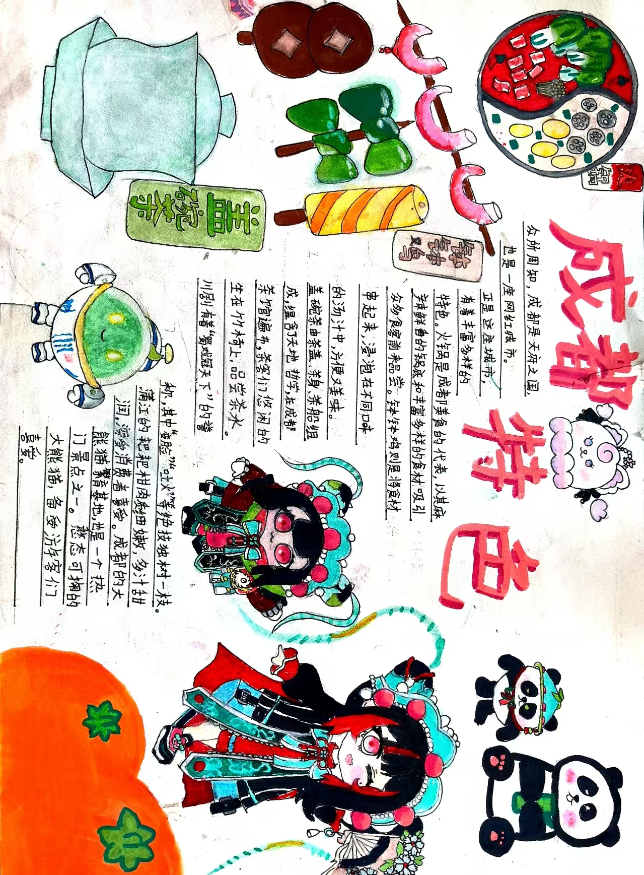 成都是天府之国,也是一座全国有名的网红城市,有着丰富多样的特色。比如,麻辣鲜香的火锅,汁味浓厚的钵钵鸡,历史悠久的盖碗茶,享誉中外的"川剧变脸",当然还有国宝"大熊猫",也有致富果"耙耙柑"、茶叶等-。成都天然的地理优势,孕育了丰富的资源,让人民过上了幸福美满的现代生活。