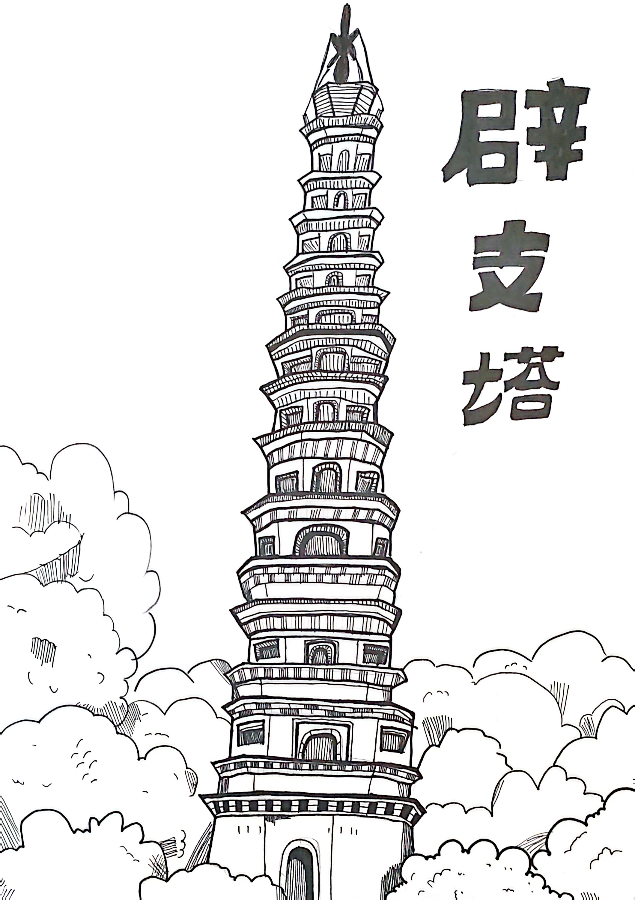 《辟支塔》以黑白线描还原了山东济南灵岩寺的辟支塔形制,却暗携西北佛塔的文化脉络。画中密檐式塔的层叠结构,与西安小雁塔的"密檐"特征同源——皆承自南北朝至隋唐的佛塔建筑体系,而西北作为佛教东传的核心通道,正是这种形制的重要传播枢纽。线条对塔檐弧度、门窗拱券的精细刻画,既显中原建筑的规整,也藏着西北石窟寺建筑(如敦煌莫高窟佛塔)的装饰基因。云雾的写意晕染,呼应了西北佛塔常伴的"梵天云气"意象,让这座鲁地佛塔,成为西北佛教文化东渐的视觉注脚,也让建筑线条里的刚硬与云气的柔缓,凝成跨地域文化交融的生动缩影。