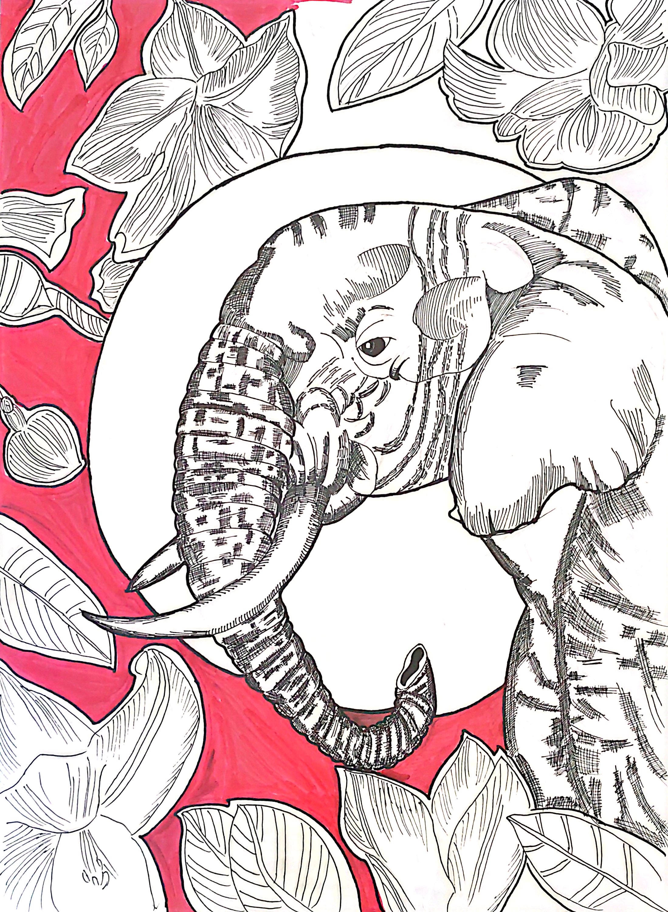 这幅象绘以浓烈红底衬黑白线描,锚定"象"这一丝路文化里的核心神兽意象——古丝绸之路上,象是西域向中原朝贡的珍兽,也是西北佛教艺术(如敦煌壁画"普贤乘象")的经典符号。画中象的肌理刻画复刻了敦煌壁画里"象王"的写实技法,花叶元素则取西北民间剪纸的夸张造型,红底的浓烈色调贴合西北艺术的奔放特质。它既是丝路商道里"异域珍奇"的具象化,也藏着西北文化中"象驮祥瑞"的民俗寓意,让神兽意象与地域美学交织,成为丝路文化在西北落地生根的鲜活见证。