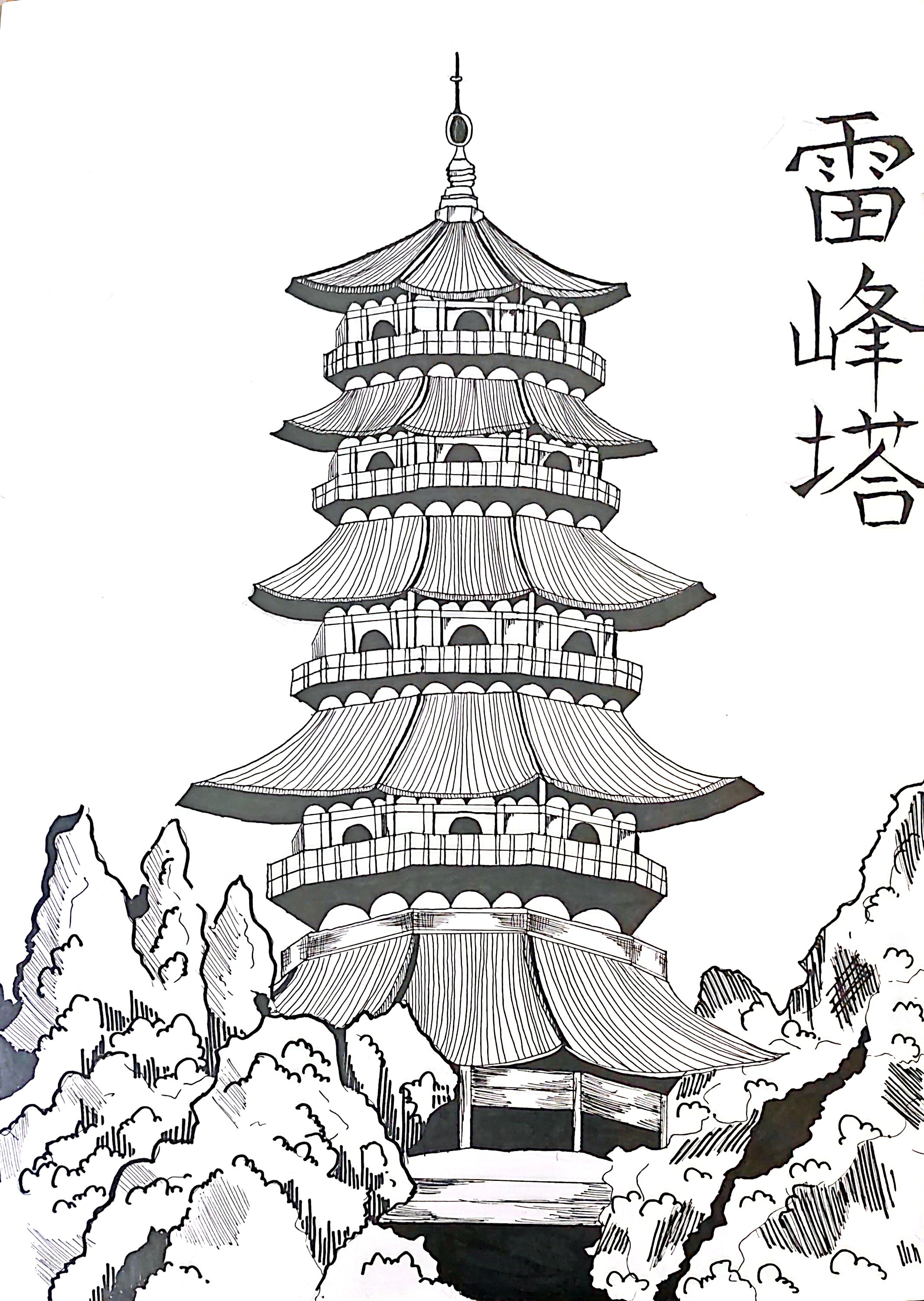 雷峰塔》看似是江南建筑,实则暗织西北文化的影响脉络。画中楼阁式塔的飞檐曲线,与西北唐代大雁塔的"歇山顶"形制同源——唐代建筑技艺经丝路东传,让江南塔刹也染上西北的建筑基因。线条对塔檐瓦当、回廊栏板的刻画,复刻了敦煌壁画里唐代建筑的装饰细节,背景山石的皴法也借鉴了西北壁画的"山水晕染"技法。它以江南塔为载体,藏住了西北建筑文化的东渐轨迹,让飞檐的轻盈与塔体的厚重,成为南北文化借由丝路交融的视觉注脚,也让"雷峰塔"超越地域,成为跨域文化共生的艺术缩影。