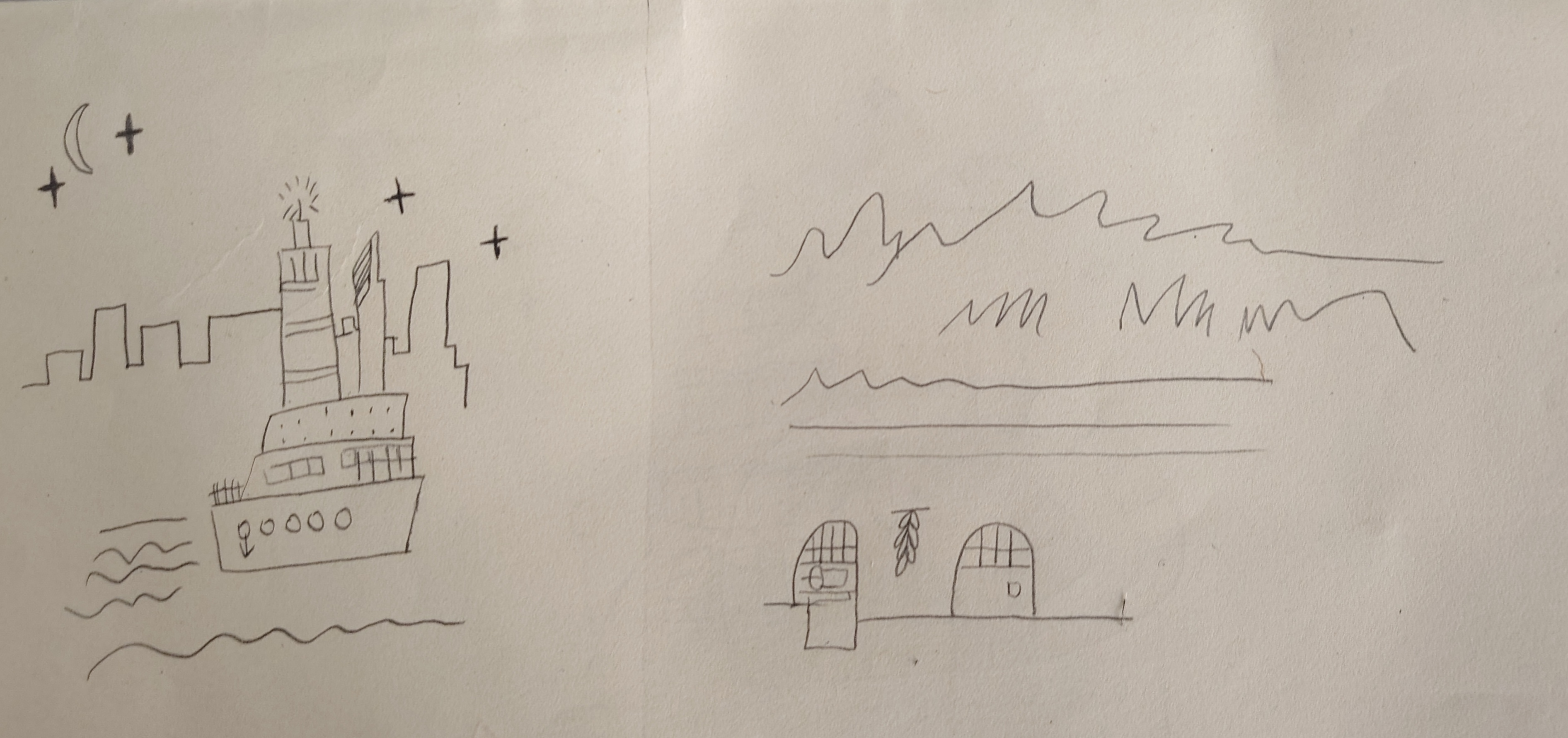左侧场景 主体是一艘船只(带有高耸的塔楼结构,疑似灯塔船或作业船),周围搭配城市建筑轮廓,背景有月亮、星星等元素,呈现出"城市滨水夜景"的氛围。 右侧场景 以层叠的山脉轮廓为主,下方配有带拱形窗户的建筑(疑似城堡、教堂类建筑),整体是"山地建筑"的意象。 山脉用波浪线条表现层次,建筑细节(如窗户格栅)增加了场景的辨识度。
