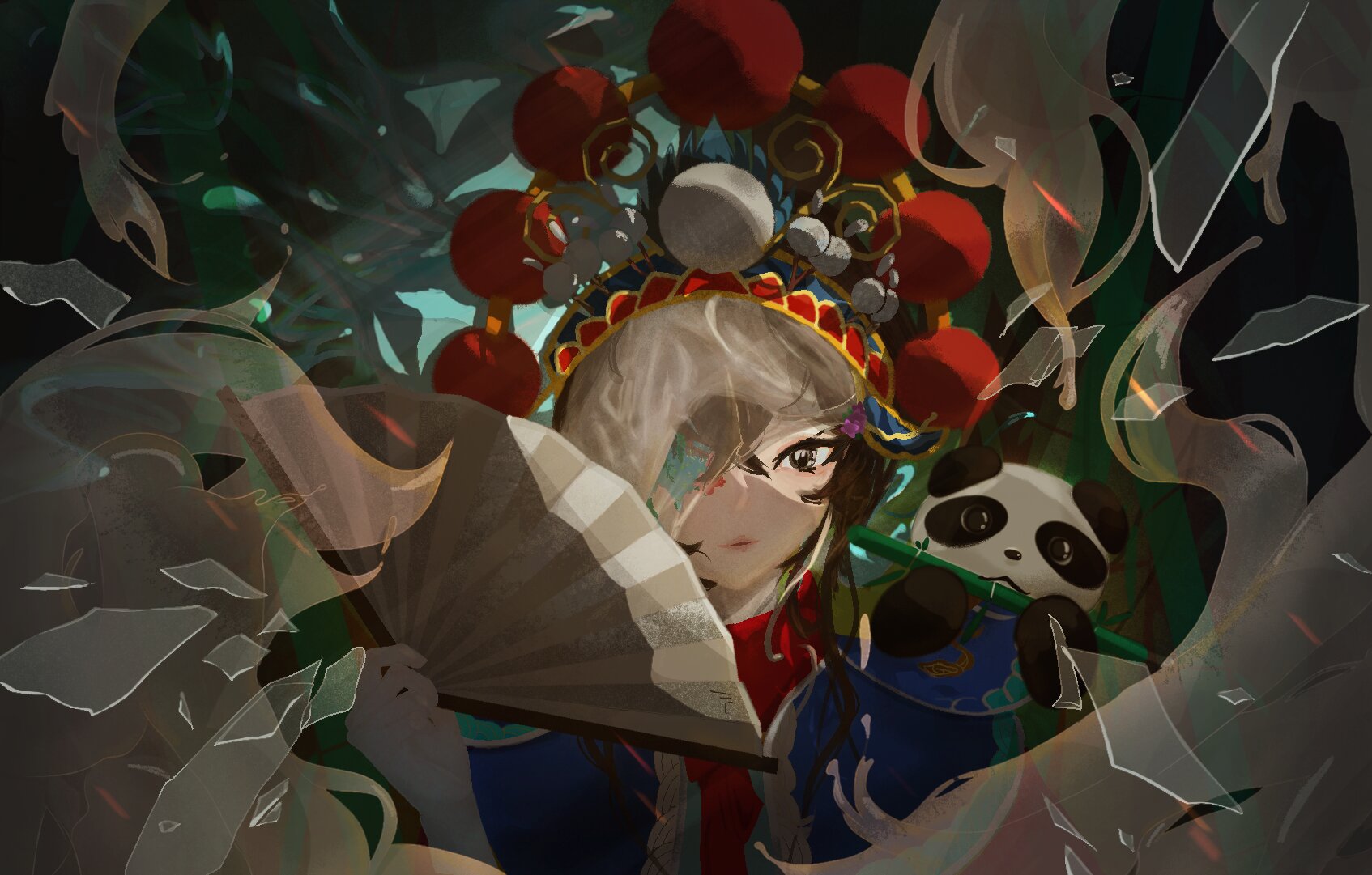 这幅画融合传统与奇幻元素。其中破碎玻璃与流动烟雾营造出梦幻又神秘的氛围,诉说一段跨越现实和幻境的故事。在现实生活中,无数人有着自己的梦与追求,文化传承的火种虽微弱,但也从未停息!愿每一个人都能在独属于自己的境界里,绽放自己的色彩;愿每一位追梦者都能在逐梦道路上披荆斩棘,勇往直前。最终在现实与幻镜交织中找到属于自己的天地,让梦想照进现实!
