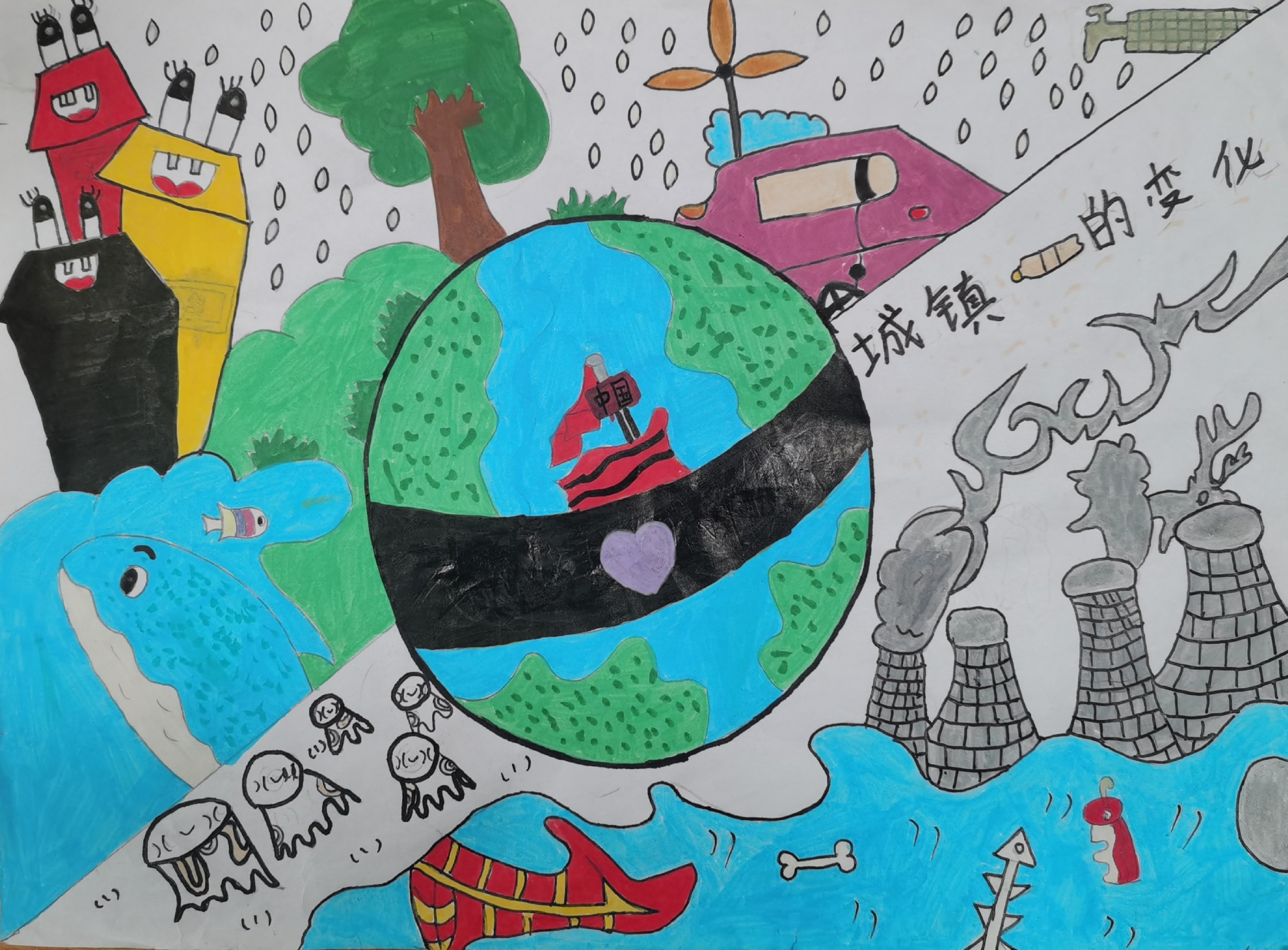 我的家乡小镇变了:高楼冒出来,汽车跑起来,烟囱却熏黑了河水。 那天我蹲在河边,见小鱼裹着灰沫躲,老槐树耷拉着叶。后来镇里竖起风车,烟囱闭了嘴,雨水洗亮了楼墙。如今再看,地球画里的红旗旁,河水又蓝得晃眼——原来变化不是丢了绿,是把它揣在日子里守着。