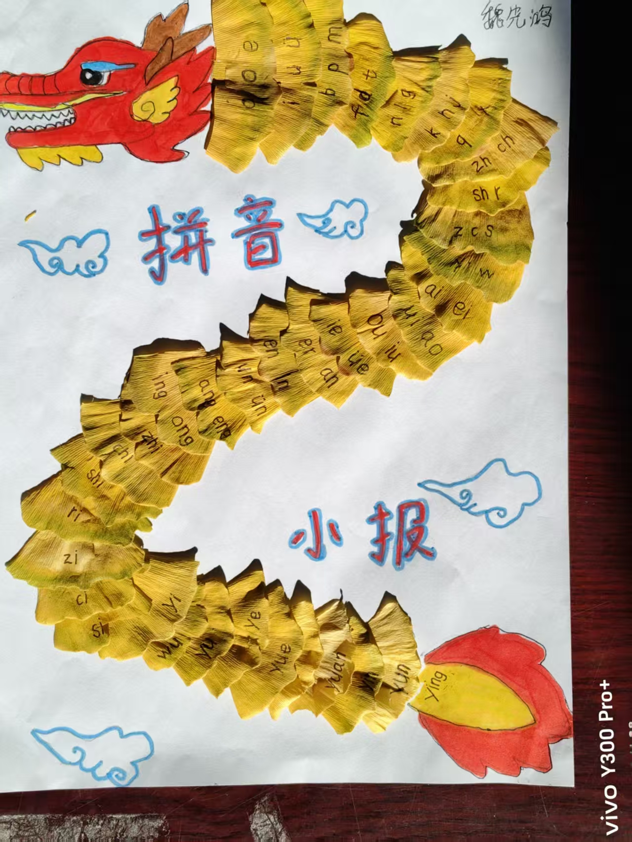 周末我和妈妈到郊外散步,我看到飘飘落叶,随风飞舞,我捡起一片银杏叶,觉得银杏叶非常好看,我就捡了许多银杏叶,用银杏叶粘了一条龙,我给他起名银杏龙,并画上龙头龙尾,我希望我的这条银杏龙能留住秋天,能在空中飞舞。