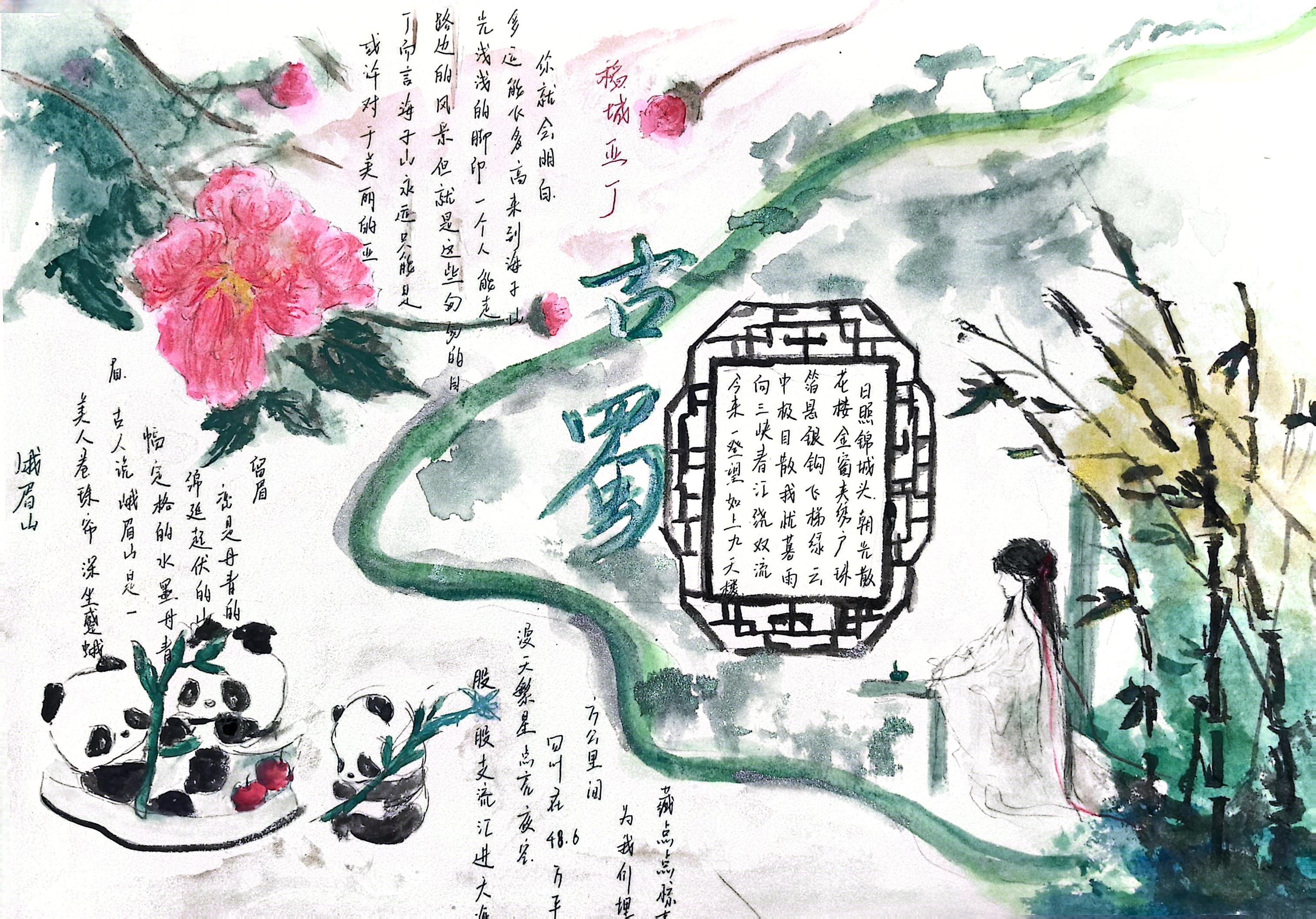 这个作品的主题是家乡特色,在构成元素上.我选择了木蓉花、熊猫、画卷、竹子以及一个人物在竹林中喝茶。木蓉花是与蓉城的代表花本卉,而熊猫作为国宝也主要分布于四川,在画面左侧我把熊猫嬉戏打闹放在花下方,然后为了让面画面不会太空荡。选了一些峨眉山和稻城亚丁的一些优美句子去填补空缺,右边就是一幅蜿蜿蜒绵长的画卷和闲的竹林饮茶,年轻人可以穿在着汉服在阳光喜微的某一天集聚在一起喝茶聊天,可以一起去看看熊猫,去赏赏花。这些种种的独特元素构成了我们独特的四川。