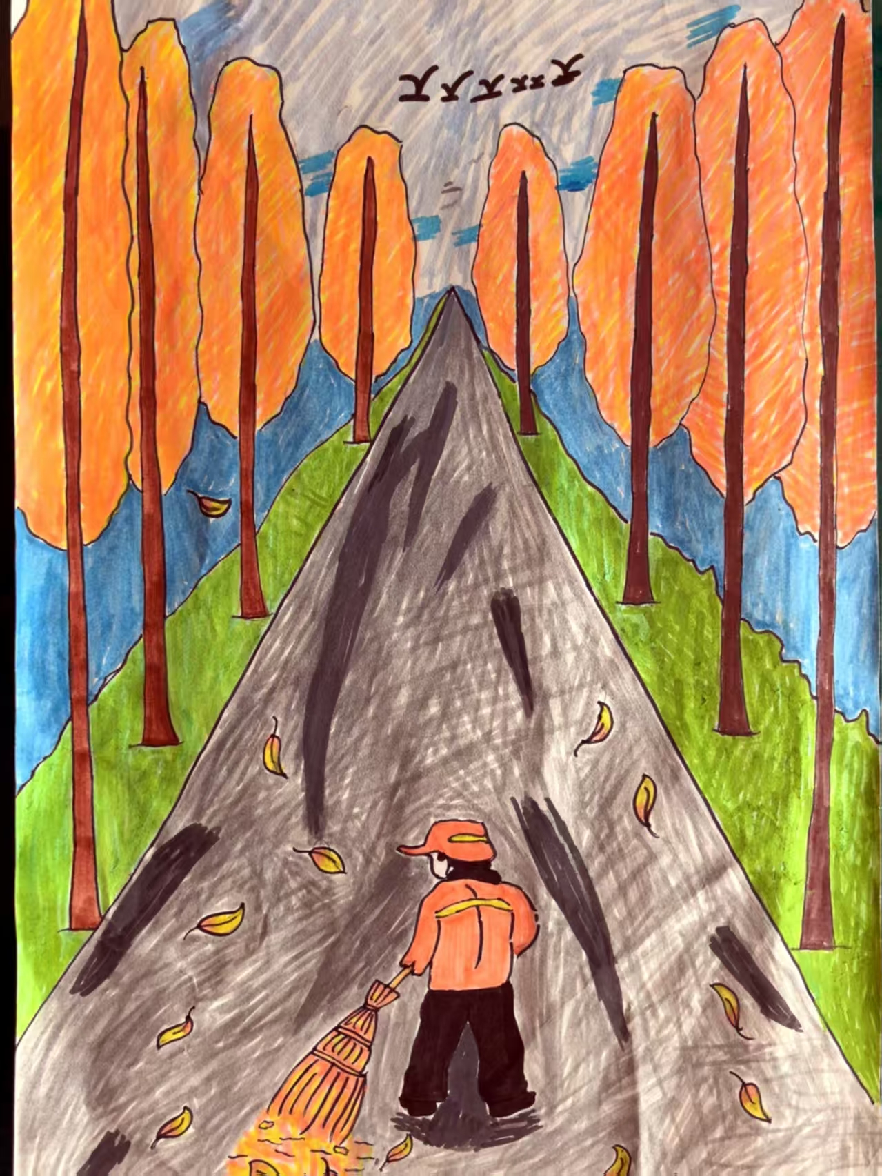 秋天来啦!他提前告诉大雁,雁群便率先往南飞去,去寻找冬天的温暖;雁阵掠过大树,偷偷告诉树叶,秋天来了,树叶便慢慢腾腾飘落下来,在空中跳一首圆舞曲,优雅地躺在地上,化作大地的棉被,倾诉"归根"的恩情;树叶飘过清洁工面前,深情地说:谢谢您,好心人!让我们兄弟姊妹离开爸爸妈妈的怀抱,还能团聚在一起。"唰!唰!唰!"大扫帚横扫天下,告诉路边的小草,秋天来了,你们准备好迎接冬天了吗?