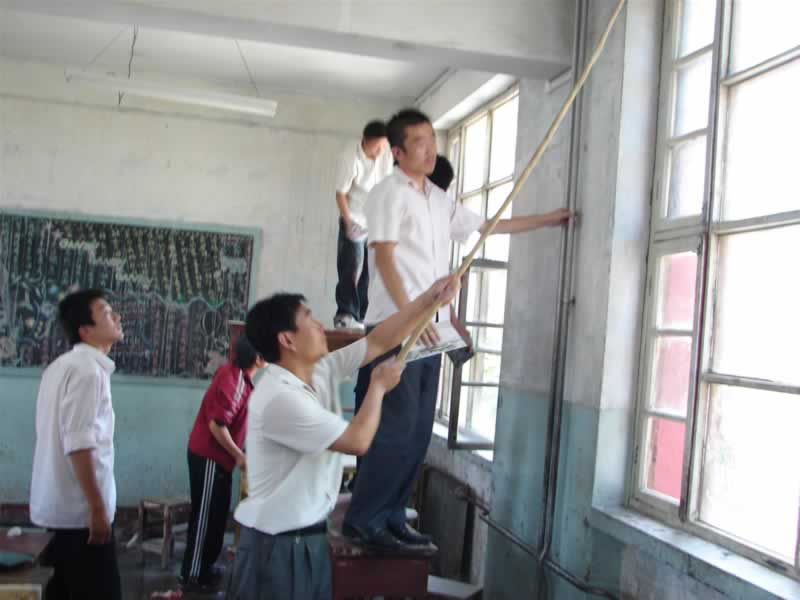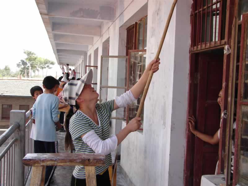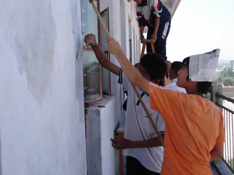 我校教师都积极参与到这次行动中来了。你看,这是我们语文老师——王平,他手持用长棍子和扫帚绑成的"长手"站在下面正刷墙上的灰尘和浮落的涂料呢。他的旁边还有几个学生也来帮忙,他们平时很少干农活,这次也主动来实践。
