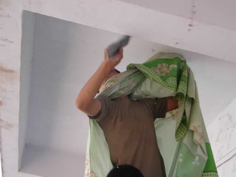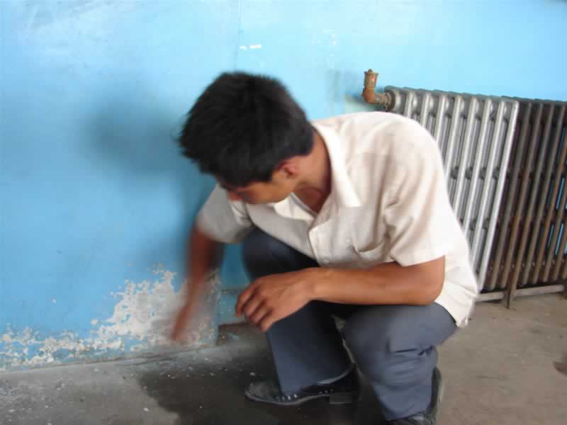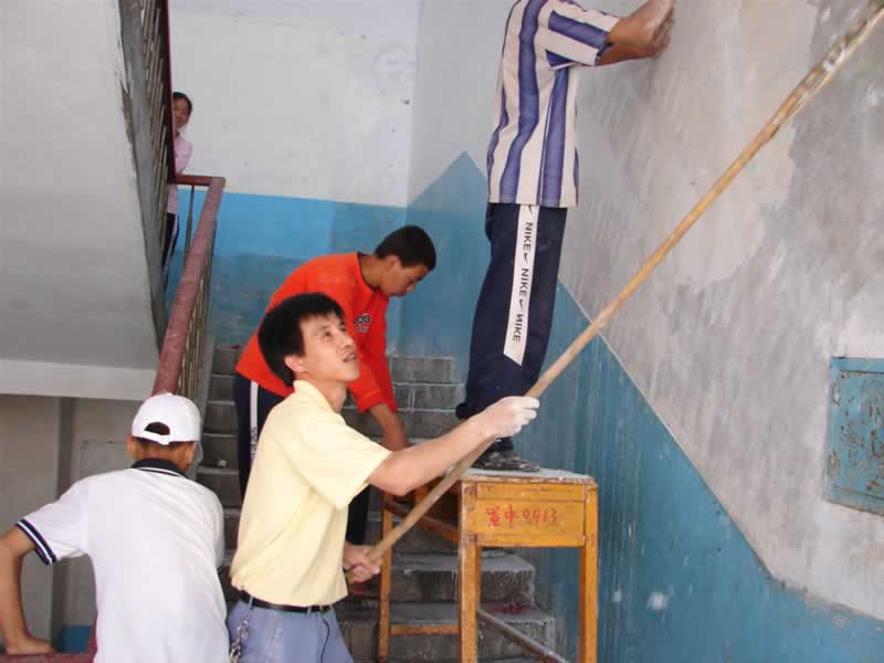这个人知道是谁吗?他是我们学校管理远程教育多媒体电教室的微机老师。别人都忽视了前脚下的区域,他发现后,默默地蹲下身来正在打磨呢。他说墙上要刷漆,必须把这些灰渣都去除掉,否则刷上的漆又会脱落的。