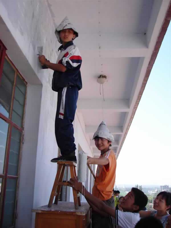 这几位,有我们班的班长,学习委员,下面扶着凳子的是几个小组长。"身在高处不胜寒"啊,这可是我校西楼的最高层——五楼,有几个"随身保驾的,他们一点也不害怕,头戴圆锥形报纸帽,用刮刀清理墙上的浮皮,看到我来给他们拍照,一点也不害羞,还抢镜头哩。