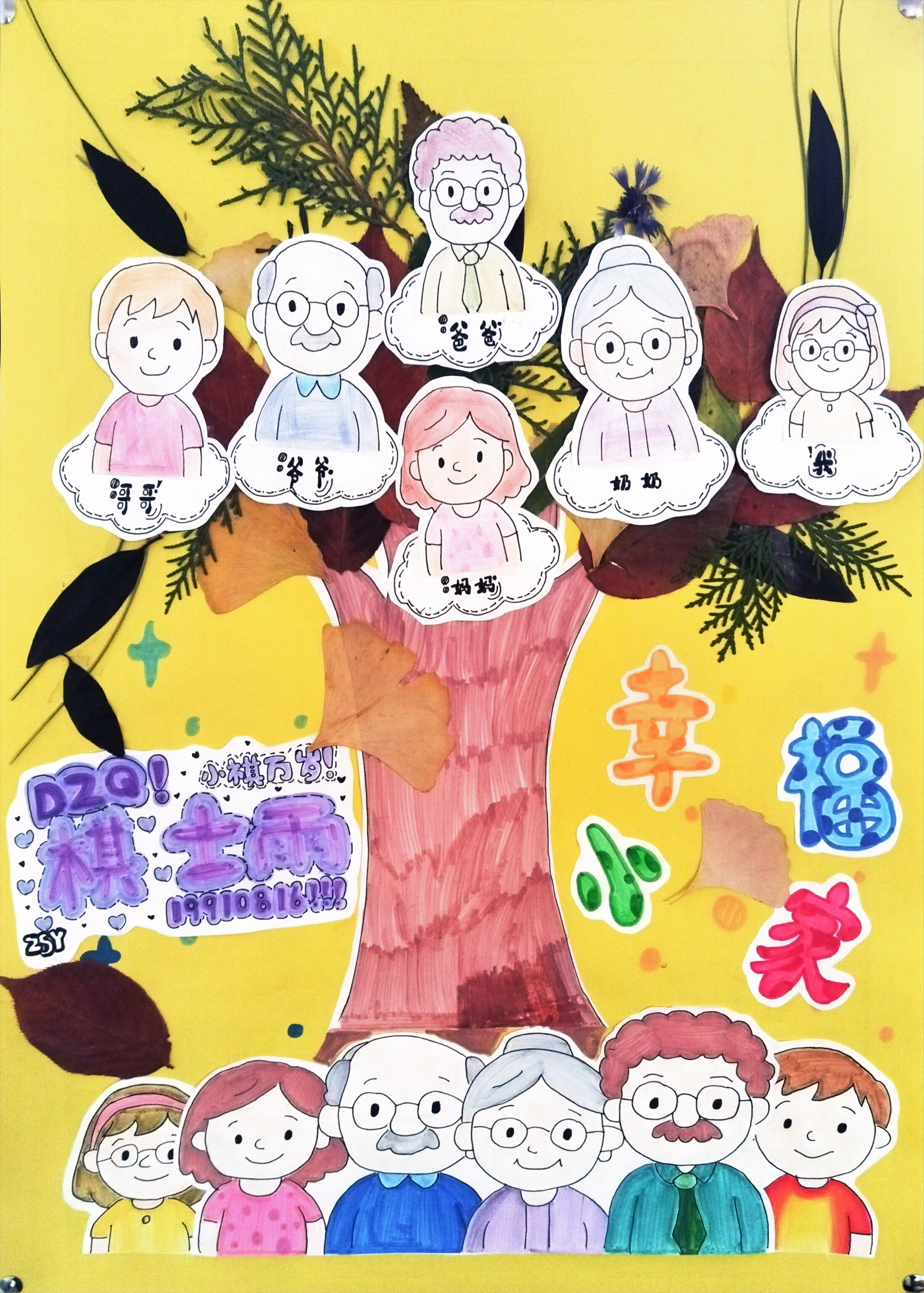 用 "家庭树"的形式,把家人像枝叶一样凝聚在 "家" 的根脉里,用童趣手工传递亲情与幸福。角落的 "D29!小林万岁!"棋士雨" 等细节,是把家庭里的专属记忆(比如纪念日、昵称)藏进作品里,让它不只是装饰,更是 "我们家的故事本"