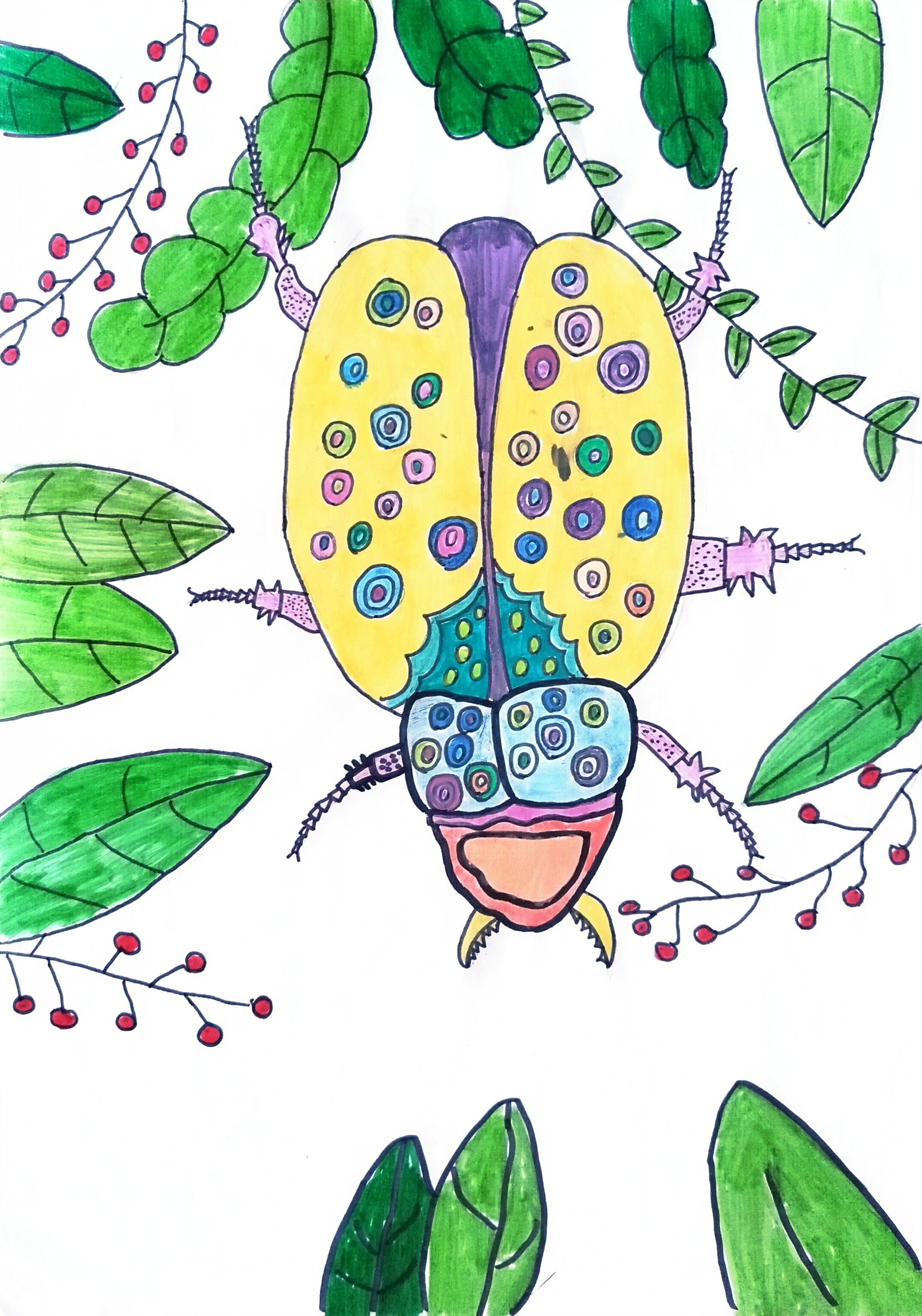 明黄背甲上缀满粉紫蓝绿的圈圈斑纹,像把调色盘里的糖果色都撒在了虫壳上;头部的蓝粉撞色 + 锯齿口器,又添了点小威风。周围的绿枝叶、红浆果衬出雨林氛围,软萌的粉紫细腿让硬壳甲虫也变灵动,像藏在树叶间的彩色小彩蛋,把自然里的小生命画得又甜又鲜活。