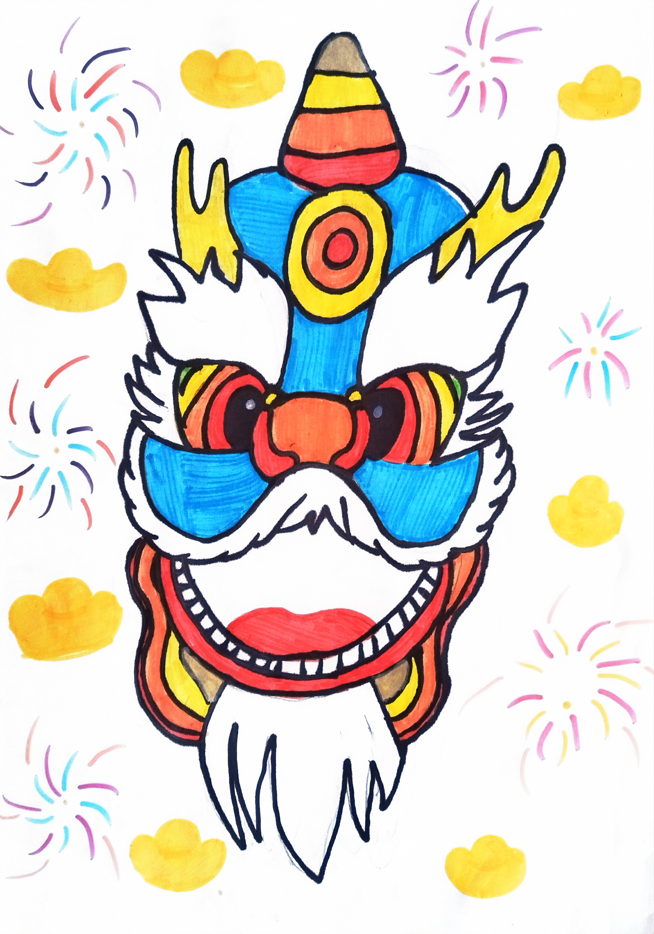 它把传统龙面画出了热闹年味:蓝白主调裹着红橙撞色,额间的彩环、眉角的黄角,像把节庆的花火揉进了龙纹里;咧嘴露齿的神态添了俏皮,周围的金云和烟花,更衬出 "闹春" 的欢喜劲儿。既保留了龙的威严,又用鲜亮色彩裹满了孩童式的热闹,像把新年的喜庆都凝在这张彩龙脸上。
