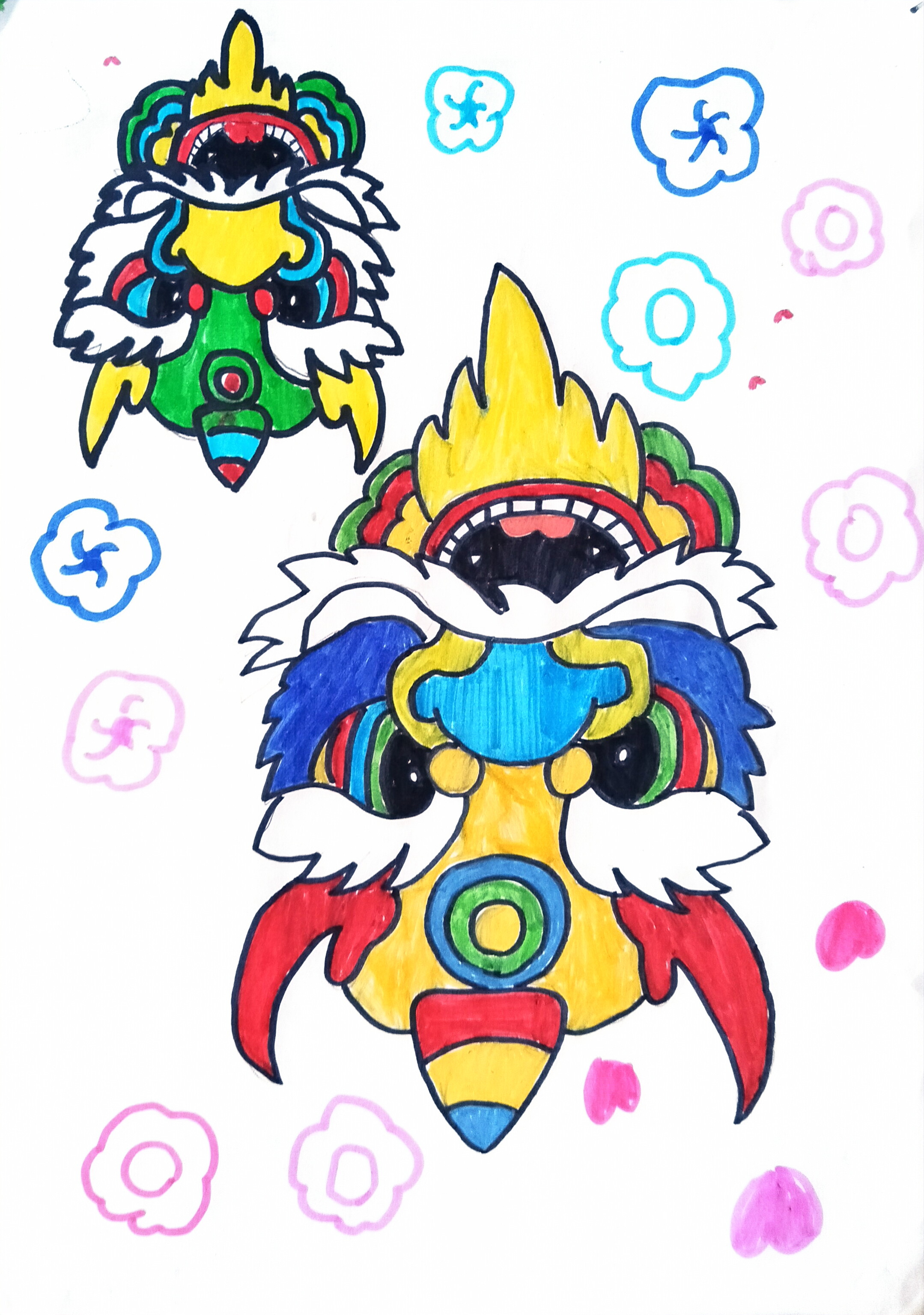 一大一小两只醒狮头,用黄蓝红绿撞出热闹:大狮鬃毛如焰,嘴裂露齿带劲,小狮绿身俏巧,同系纹样衬出 "双狮嬉闹" 的氛围感。周围彩花云纹像把节庆的糖纸揉碎撒开,既守了醒狮的传统锐气,又用孩童式的鲜亮色彩裹满欢喜,像把庙会里的热闹劲儿,凝在这对彩狮脸上。