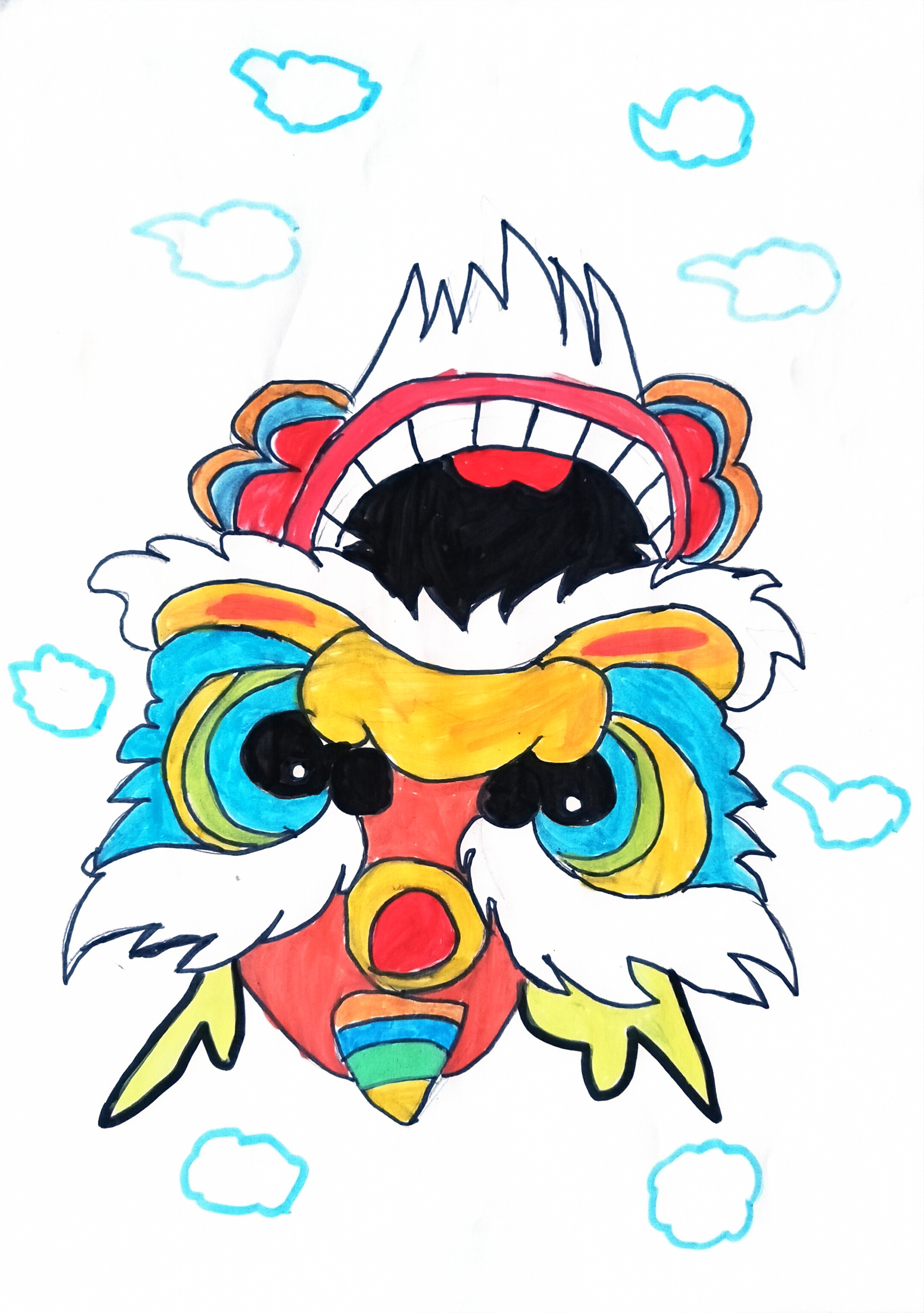 醒狮头裹着红、蓝、黄撞色,咧嘴露齿带足节庆锐气,白绒边柔化了硬朗,鼻间彩环、焰状饰角藏着传统细节。周围的简笔云纹,像把它托在热闹的 "祥瑞金云" 里,既守住醒狮的威严,又用孩童式的鲜亮配色,把庙会的欢腾揉成了云间跃动的彩狮精灵。