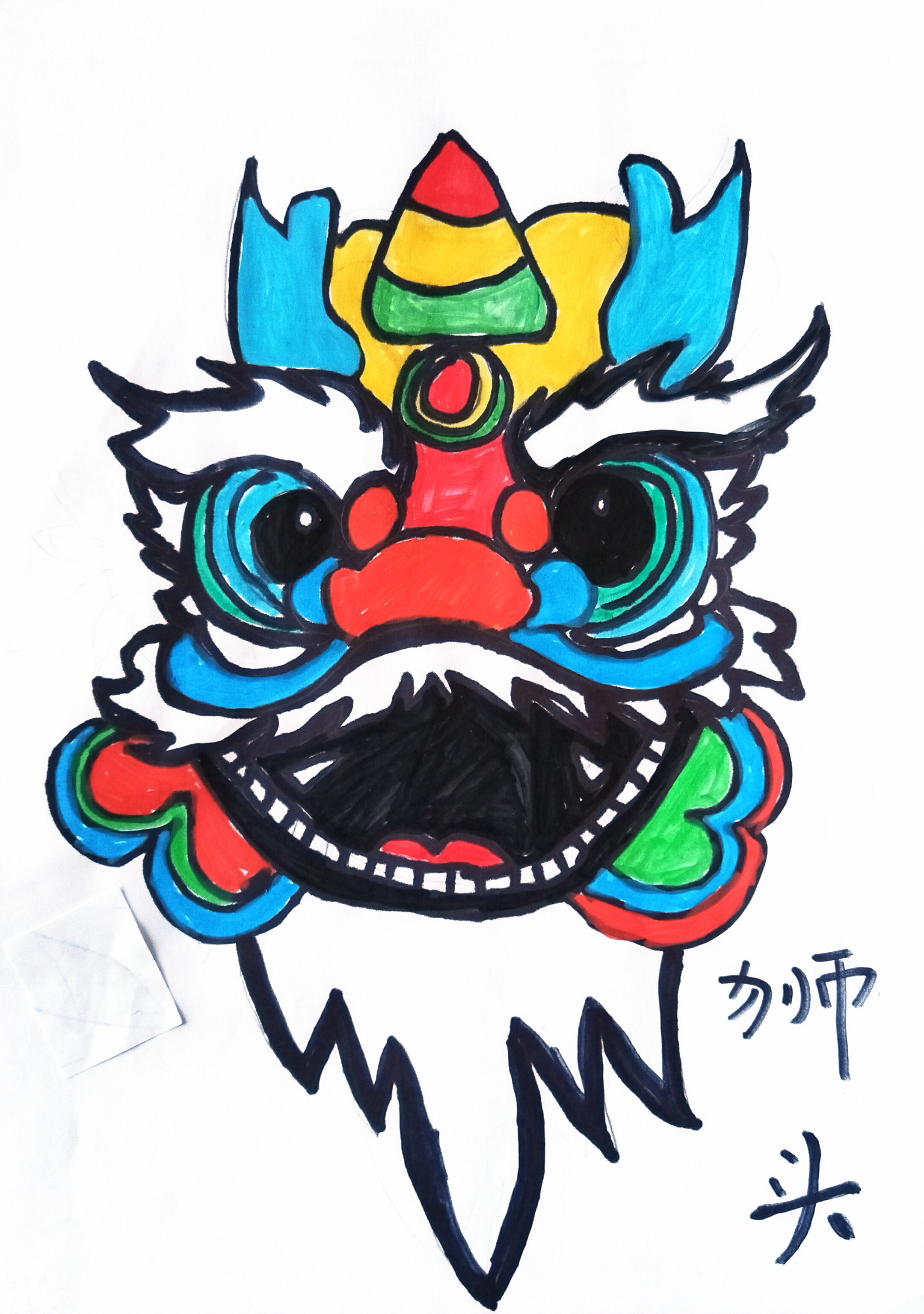 醒狮头以红、黄、墨蓝撞出热烈感:额间彩环、焰状鬃毛藏着传统锐气,咧嘴露齿的神态裹满欢腾,周围的蝴蝶、烟花元素更衬出 "舞狮闹春" 的氛围。右侧 "舞狮" 题字点明主题,既守了醒狮的节庆底色,又用孩童式的鲜亮配色,把庙会的喧闹劲儿揉成了跃动的彩狮精灵.
