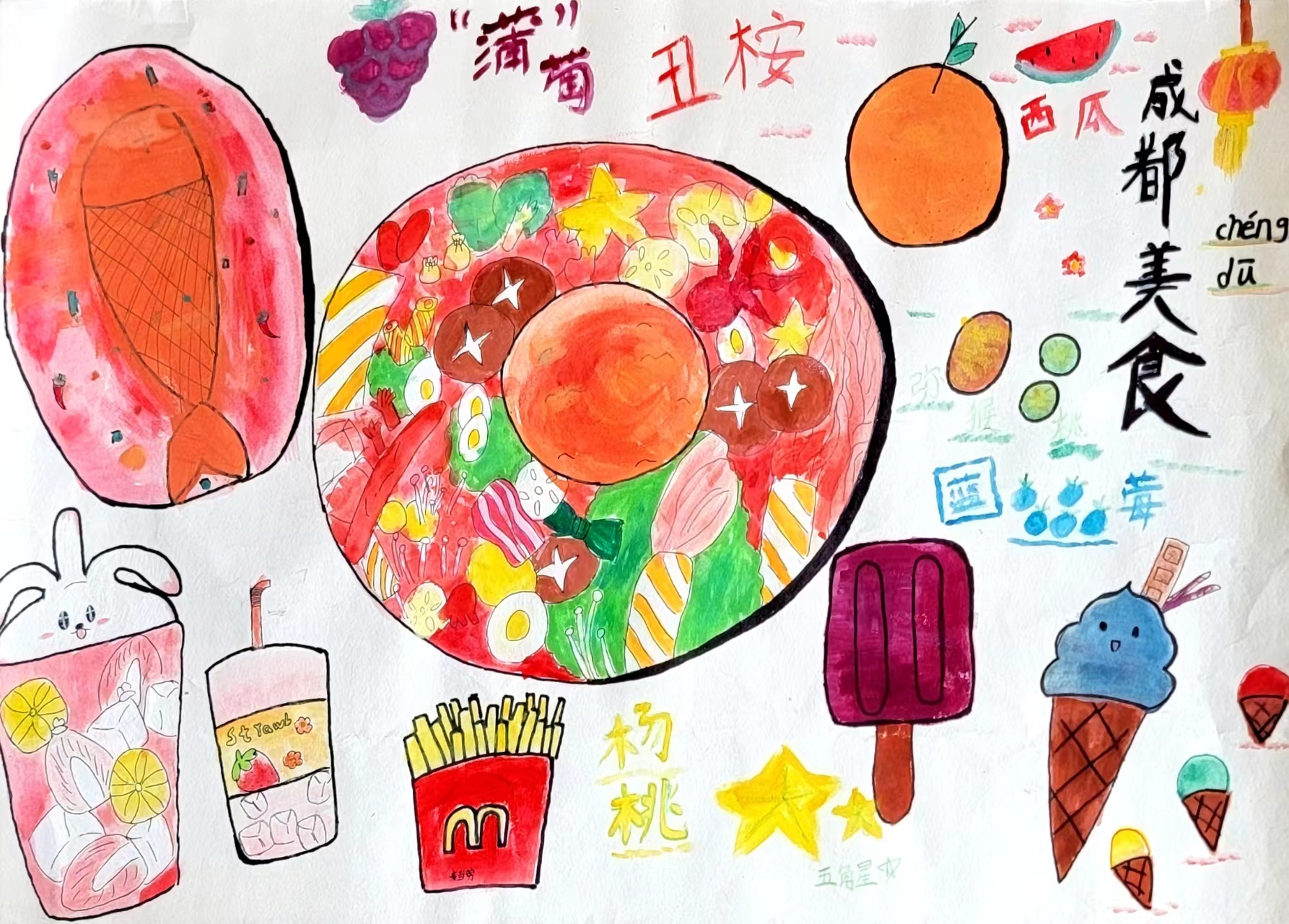 "蒲"萄丑柑是蒲江的美食,众所周知,成都有很多美食,火锅,麻辣烫,钵钵鸡,酸辣粉。其中我最爱吃的是火锅,火锅距今有5000~6000年的历史,下有火上有锅,俗称火锅,在古代叫做"古董羹"。因食物投入废水时发出"咕咚"的声音而得名,因为喜欢,所以我把它画了下来。
