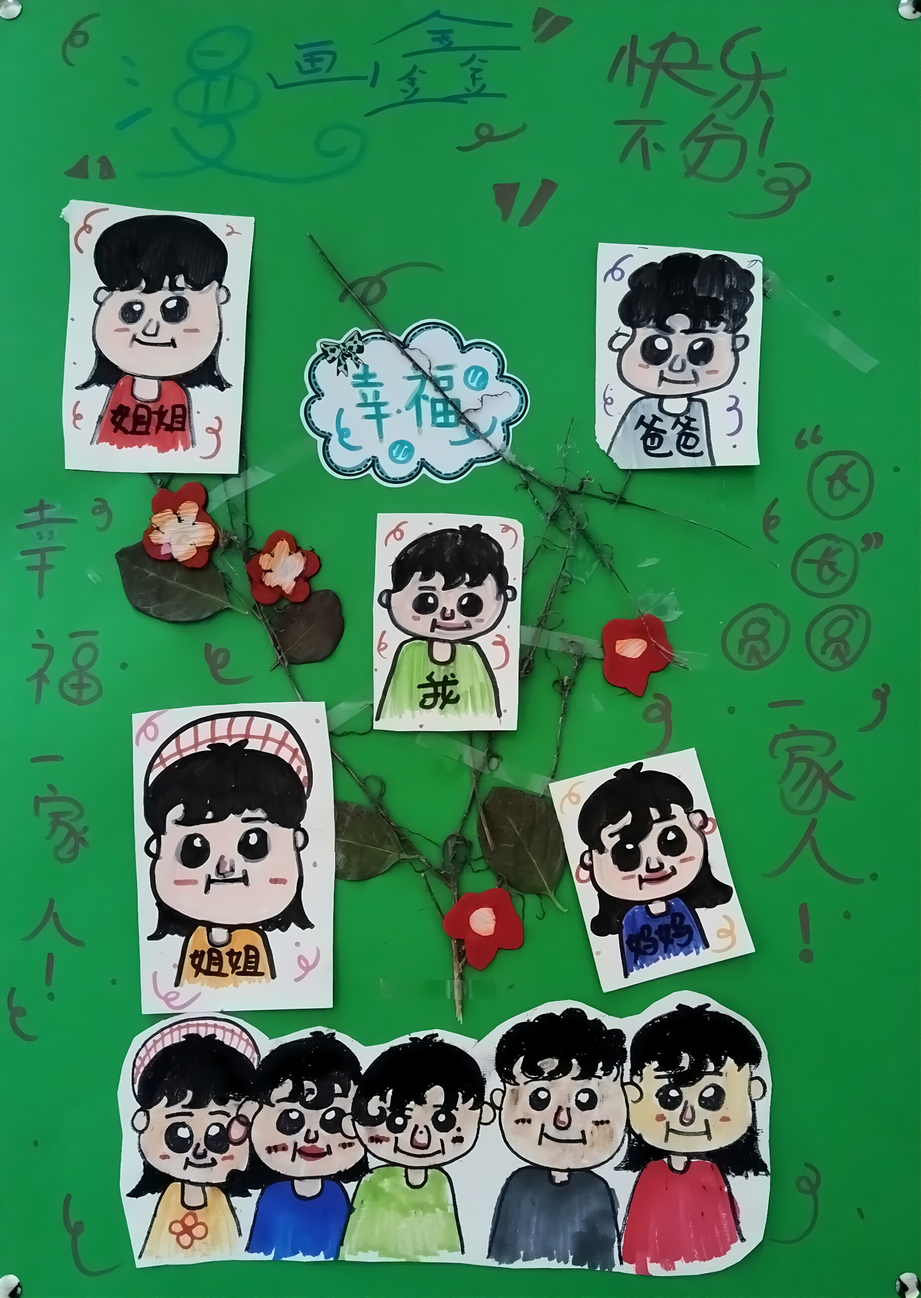 以枝叶、纸花拼贴成 "家庭纽带",手绘标注 "姐姐"我" 等身份的漫画形象错落分布,既借 "漫画盒" 的创意形式凸显童趣,又用 "幸福不分"幸福一家人" 的文字点明主题。青绿底色 + 装饰符号烘托轻松氛围,让家人的专属身份与温馨陪伴,在手绘与自然材料的结合里变得鲜活又可爱。