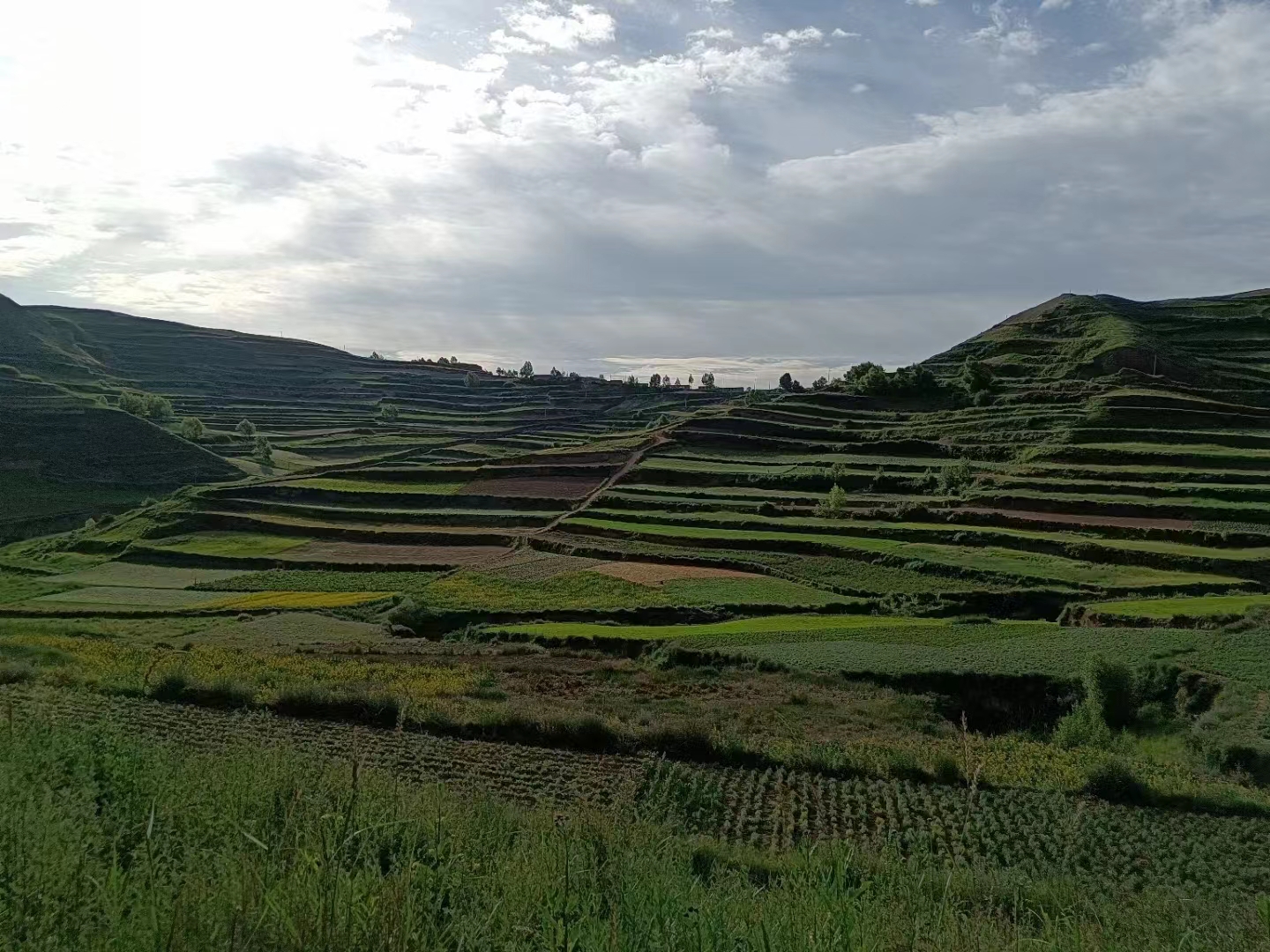 我的家在一个小山村,这里没有高楼大厦,却有着好多好看的景色,让人有一种走进画里的感觉。 放眼群山,它们层层叠叠地挤在一起,像一群挨挨挤挤的绿巨人。山尖还在藏在云朵里小屋子,像在跟我玩捉迷藏;山上长满了绿油油的小树和草,风一吹,树叶"沙沙",伴随着牛羊在轻快的歌唱。 山上的梯田更是绝了!一块连着一块,顺着山坡铺展开,绿油油的庄稼挨挨挤挤,像给大地盖了一层又一层的绿毯子。走到田埂上,看着小野花点头,听着小青蛙"呱呱"叫,感觉连空气都是甜甜的。站在山顶的小树下处望,梯田就像绿色的波浪,一层叠一层,一直铺到山脚下,别提多壮观了! 层层的青山、连片的梯田,让人心里特别舒畅,所有的小烦恼都一下子没了。