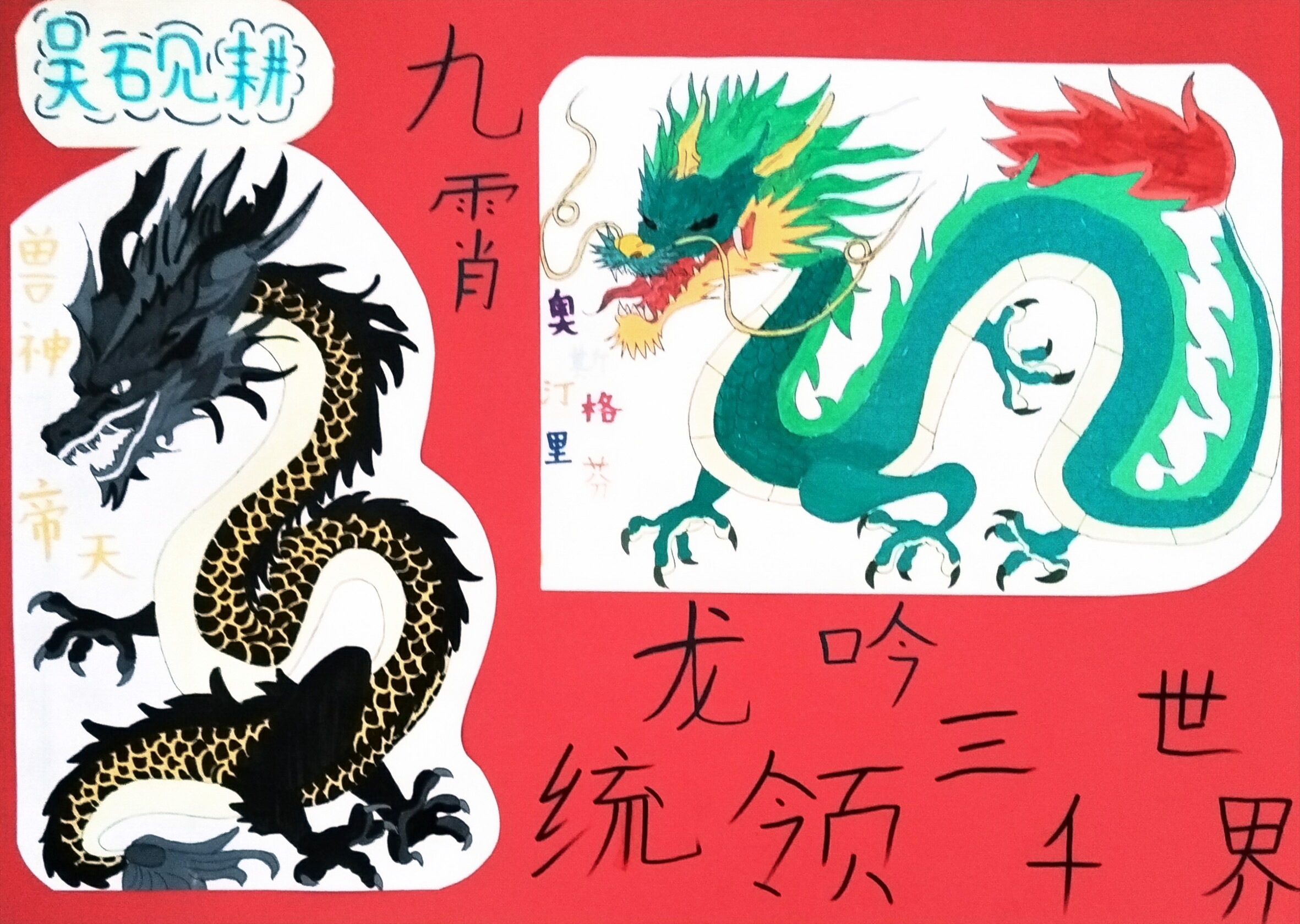 以红底为衬,手绘黑、绿双龙形象,搭配 "九零肖"龙吟三世统领世界" 等文字,既借龙的传统意象呼应生肖属性,又用鲜明色彩与霸气文案凸显个性。"吴石见耕"史格里" 的标识融入创作趣味,让生肖文化与自我表达在手绘里碰撞出鲜活张力。