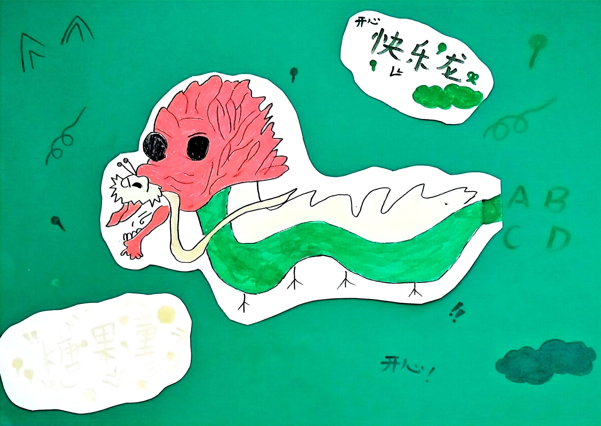 以剪贴手绘结合的方式,创作红首绿身的趣味龙形象:红首活泼醒目,绿身舒展灵动,搭配 "开心快乐龙"开心!" 的文字标识,既保留龙的传统意象,又以鲜艳色彩、卡通造型赋予其轻松可爱的气质,青绿底色与装饰元素更烘托出欢快氛围,让生肖龙的形象在创意里变得生动又有童趣。