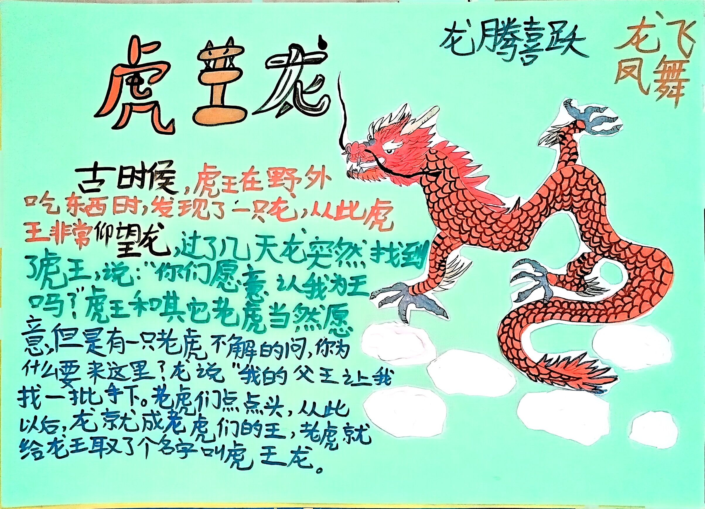 以剪贴手绘结合呈现:红鳞龙形象生动鲜活,搭配 "龙腾喜跃"龙飞凤舞" 的传统吉语,又以原创故事讲述 "虎王龙" 的由来 —— 虎群仰龙、龙承父命收服虎群,既融合生肖意象,又赋予神话趣味。青绿底色与文字排版,让传说故事在创意里既有传统韵味,又显童趣生动。