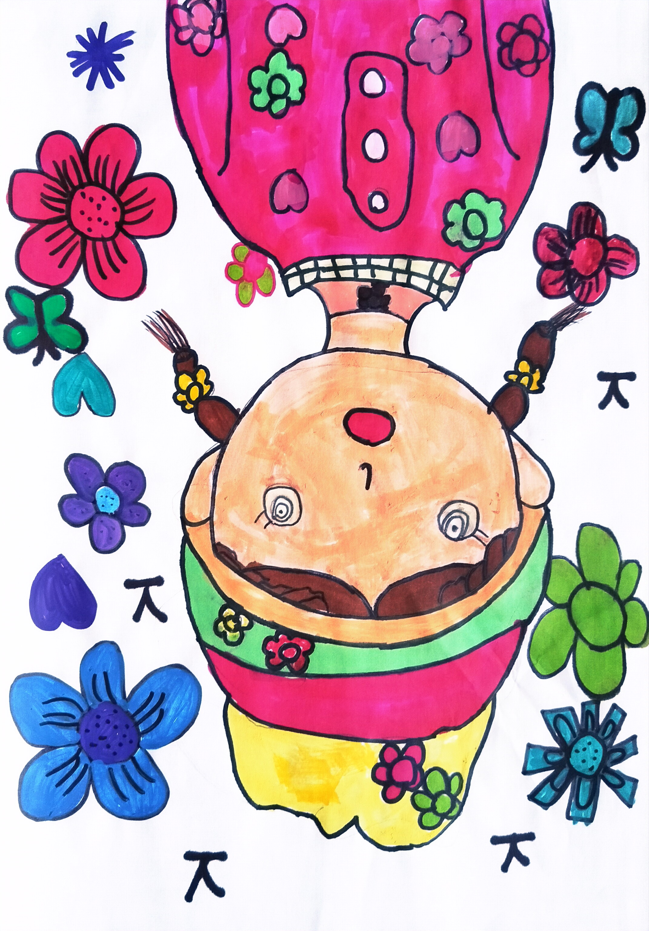 把土豆化作扎着双辫的软萌精灵:裹着粉红花衣,头顶 "冒" 出花饰帽,圆眼翘鼻透着孩子气的惊喜。周围彩花、蝴蝶像把春天全裹在它身边,连衣纹都绣着小花,既以日常土豆做创意载体,又用鲜亮撞色和可爱装饰,让平凡食材变成了藏在花团里的甜俏小生命。