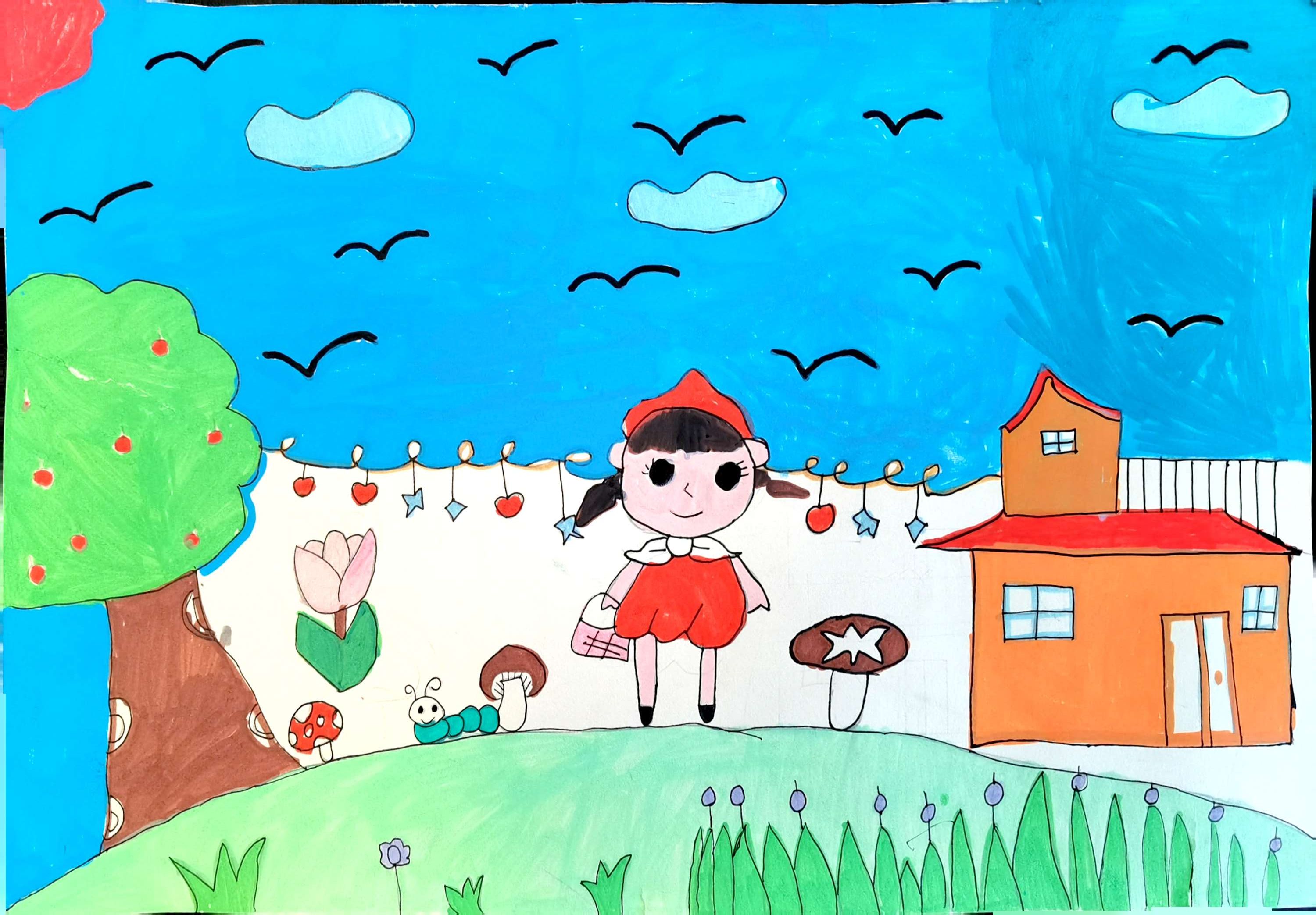 这幅画像一块童话拼图,蓝得发亮的天空里,云朵软得像棉花糖,群鸟拖着弯弯的剪影掠过,把轻快的气息揉进风里。左侧的苹果树坠着红果,像撒了把小灯笼;穿红衣的女孩扎着俏皮双马尾,裙摆沾着阳光的暖调,手里的小篮子仿佛装着刚摘的甜意。屋前的蘑菇顶着星星花纹,毛毛虫慢悠悠蜷在草间,连晾绳上的爱心、星星挂饰都在晃着软乎乎的欢喜。嫩绿地、粉花、橙屋凑成温柔的色块,每一笔都裹着孩子气的明媚 。