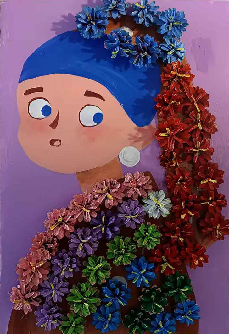 街头流行各种各样的发式,昨天那个卖百货的小姐姐还是中规中矩的长头发,今天就改头换面变成了长长的马尾辫,后天又心血不潮弄了个圆不溜汲的丸子头,脑袋后面像顶了个黑溜溜的小汤团,随着身子的走动那个丸子还一晃一晃的特别有意思。 今天我也来了一个特别的发式,让大家开开眼。 我先把街头百货店的小姐姐"请"过来,然后弄来粘性特别好的胶水,将我精心挑选的落叶松的松塔一个个准备好放上胶水,根据她的头型和身材将这些塔松粘上去,一个两个紧紧地粘在一起型发型的模样,很快发型就弄好了,然后再用高档的颜料把这些塔松染成不同的颜色,看上去特别的时尚。看着镜子中时尚的发型小姐姐惊呆了,走上T台定得头冠!