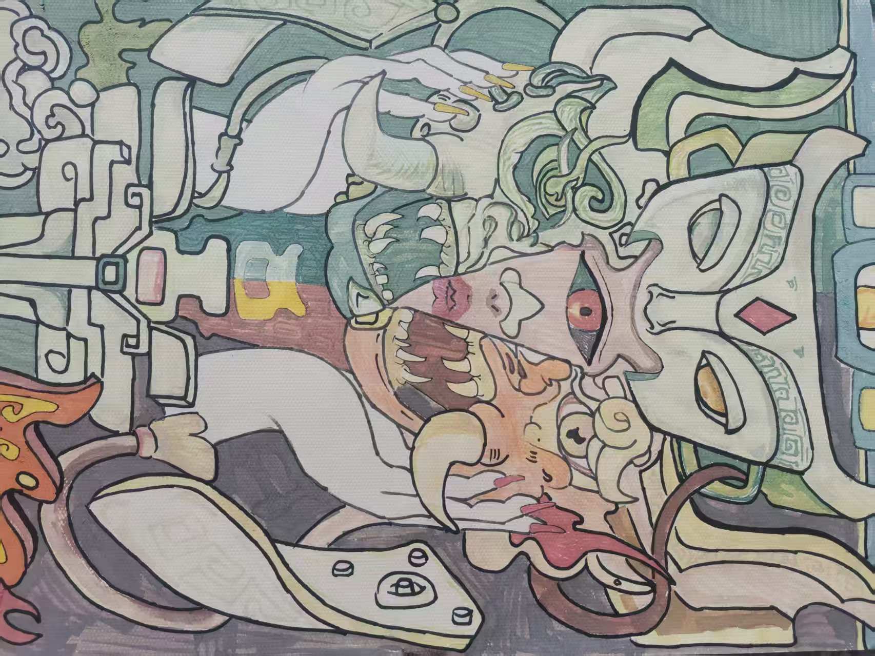 《皮囊之下》 在创作这幅画时,我的灵感来自于青铜器,我把现代人与古代文物结合起来一起创作,是想让当代人去保护文物,而不是破坏,也不是把挖掘出来的文物用高代去卖给其它国家.当我们用心去保护这些文物时,我们会发现其实它们也很美丽,也很珍贵.
