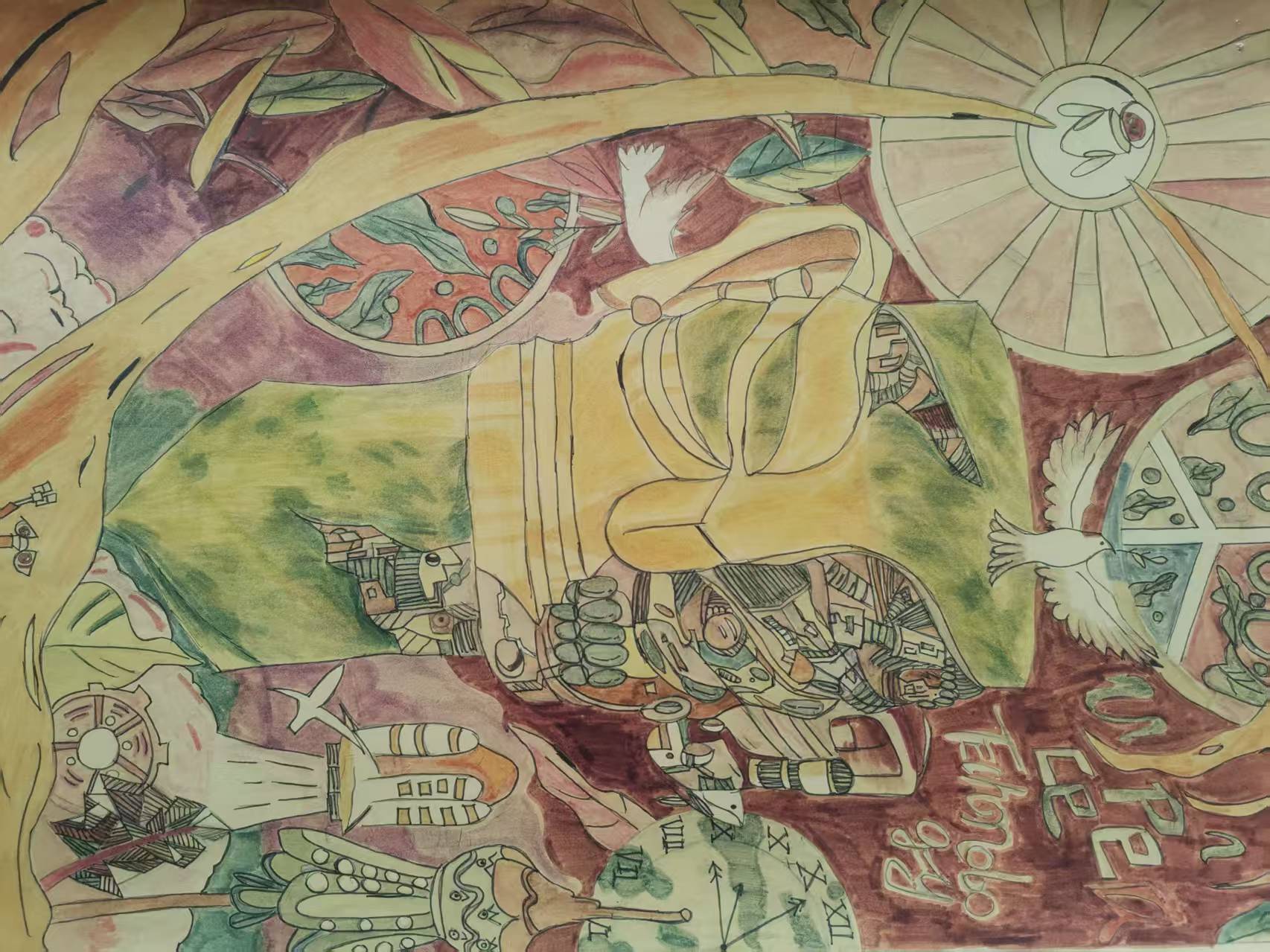 本幅作品以三星堆青铜面具为主体图膝,头顶悬浮的宫铃将青铜编钟声波具象化为和平鸽群,托举起神舟二十号载人飞船.画面通过青铜文明与航天科技的时空对话,展现人类对宇宙真理的共同求索面具瞳孔处的和平鸽衔着橄榄枝飞向星辰,象征科技发展应始终承载和平使命;宫铃声纹与飞船轨迹构成的莫比乌斯环,暗喻传统智慧未来科技的共生共荣.作品以超现实手法诠释"各美其美,美美与共"的人文理念,既彰显中华文明的深邃底蕴,又传递构建人类命运共同体的美对愿景,昭示着当科技发展与文化传承共振必将谱写出守护地球家园的永恒乐章.