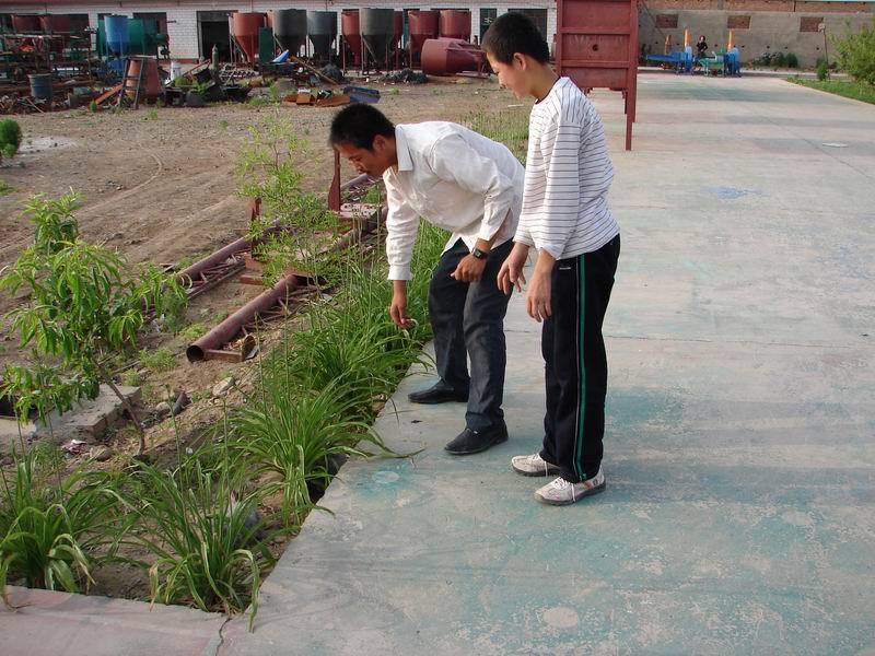 弟弟拔了一把草,连哄带赶,终于把小灰免从机器堆里揪出来,放在机器上,好好接受小弟的批评教育。