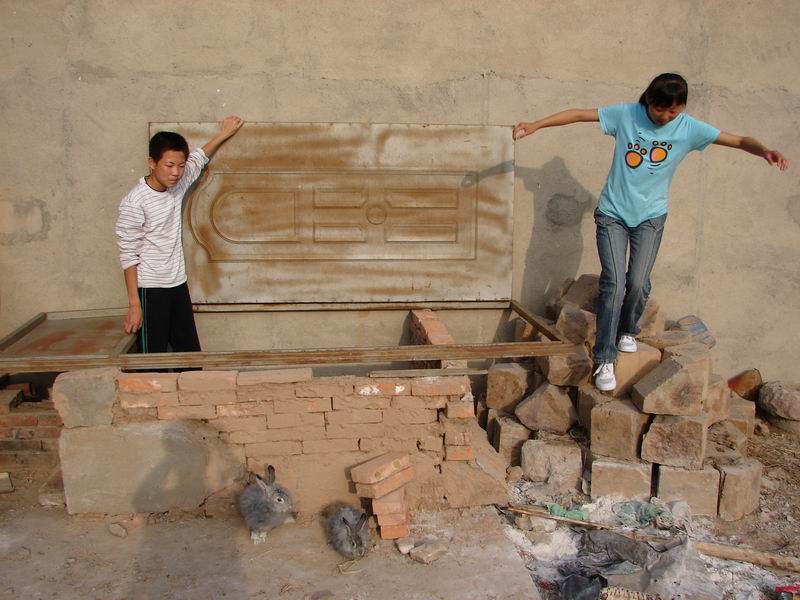 看样子小灰免们没个家可不行,我和弟弟便在墙角里给它们堆砌了个简单的家。怕下雨淋着免子,便弄了个废门板做了屋顶。这下小免子们可以享受家的温暖了。