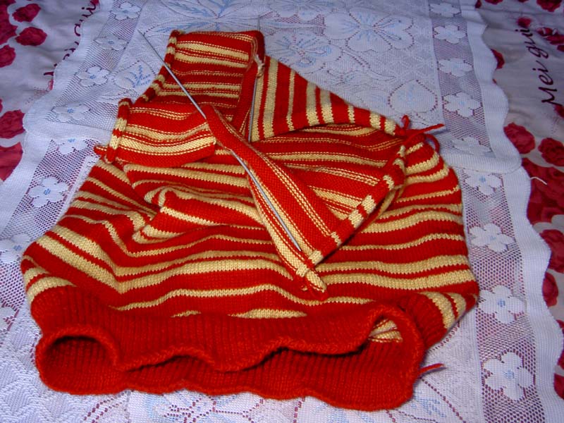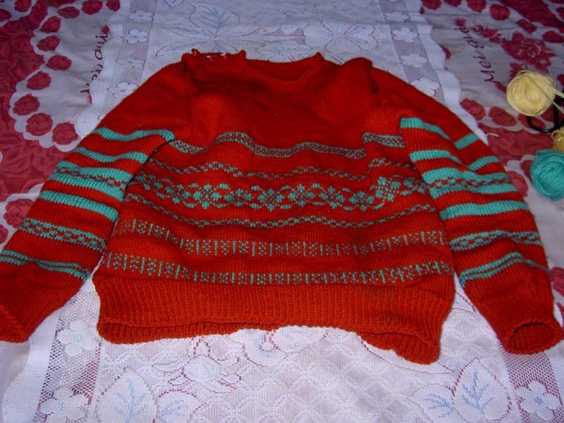 手工编织毛衣先是从底边开始编织,一圈一圈向上编织,直到编织好衣服领口,最后用签子挑出袖子的针,再织袖子。