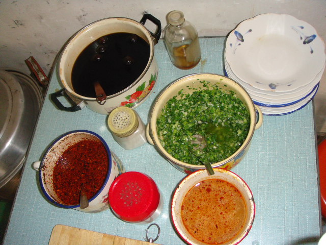 看到这里,你也口内生津了吧!不用着急,如果你到青海来旅游,到处都有酿皮摊点。如果自己制作,用料、做法都比较简单。做酿皮的主要用料是面粉和少许食用碱。在面粉中放少许食用碱,用温水和成较硬的面团,几经揉搓,直到面团光滑、富有弹性。然后,将面团放到凉水中,反复揉捏,洗去淀粉,直到面团成蜂窝状的软胶样为止。这软胶样的面团在蒸笼中蒸熟就是"面筋"。剩下的面糊切不可倒掉,它就是制作酿皮的主料。面糊待沉淀后,倒出浮水,将面糊搅拌均匀,舀到平底的大盘子中(也有专门做酿皮的铝盘),放到蒸笼中蒸熟,这种酿皮叫"蒸酿皮";如果将面糊舀到厚铝锅中,在火炉上烙熟,就叫"烤酿皮"。吃时将酿皮切成条,面筋切成块,浇拌佐料即可。