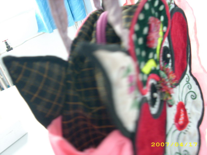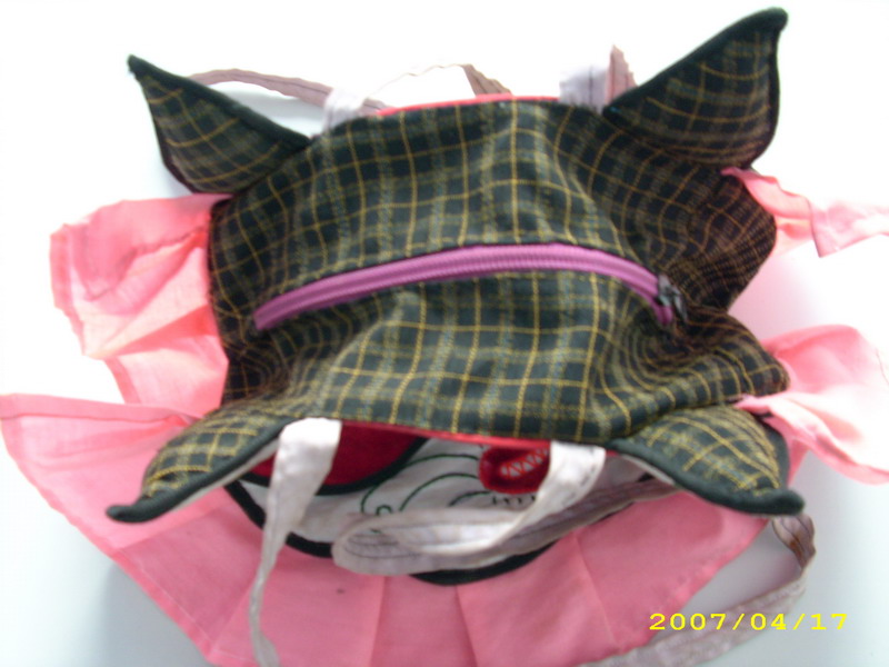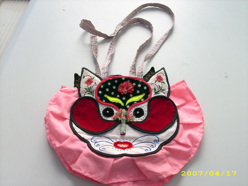 这所以叫它宝贝袋,其主要原因是小孩子们都很喜欢,当然大人们也不例外,看看宝贝袋那有趣的脑袋,你可以认为它是小猫头,也可以认为它是老虎头,总之它既不是蓝猫的脸,也不是《小虎还乡》里面小虎的脸,它是家乡妇女们心中的象征,天使的化身。