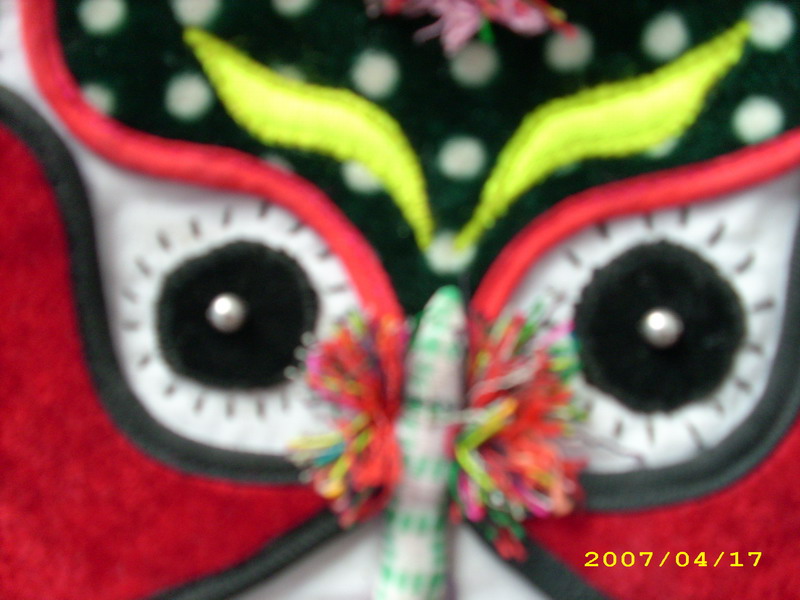 宝贝袋的脸部主要有四部分组成,白白胖胖的脸边青色的边子,脸蛋红红的,大概是因为它给老鼠送玫瑰花,被人家拒绝了,羞闰吧!看它那金黄色弯弯的柳叶眉,是不是能同林黛玉的眉毛相比呢?额头上的那朵小花,什么时候开花呢?……永远都不会!对了,这只小猫大概是很听话,你看它那两只耳朵无时无刻的"耸立"着,或许在倾听人们的心声,或许在表示自己的威力,耳朵上还结着梅花!怪哉!