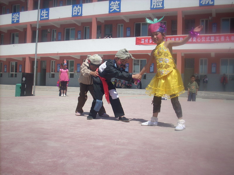 在这时一个小姑娘弯腰驼背的扮了个老奶奶走来,她身上穿的很朴素,头上也顶了一块白毛巾,逗的观众们又一阵大笑。“老奶奶”站在“老爷爷”的后边使劲拽,但两个人的力量还不能够拔起那个萝卜,一不小心又跌倒了,坐在了地上,这时,几个小朋友扮演了几只小狗跑过来帮忙。
