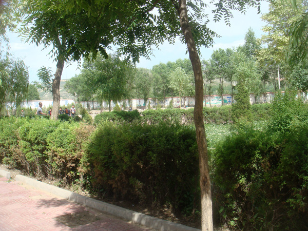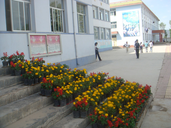 走进泾源二中你的眼光会为之一亮,因为你被"腾飞"和旁边的花所吸引。看!门厅前那排摆放整齐的呈三角形状红的、黄的花儿,正在微风的吹拂下向你频频点头,似乎正在欢迎你的到来。