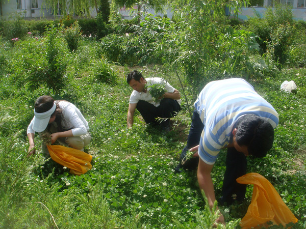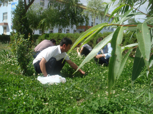 在除草的过程中他们神情严肃,偶尔会看到一丝微笑,阳光下他们的汗水在不停地滴着。远处,传来细小的声音,"啊!扎死我了"。因为这不是一般的草,那可是全身长满刺得草,能不扎吗?但是,这个队伍没有一个退出。