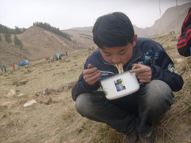 中午终于到了,周玉雄脚后那一排又一排长而深的大坑,他露出了光荣自豪的微笑。我也为有这样一个能吃苦耐劳的朋友感到自豪。不一会儿,吃午饭了。他也许太饿了吧!马上拿起饭缸子去打饭,刚打上来就津津有味的吃了起来,看着他那狼吞虎咽吃饭的样子,我不由的笑了。